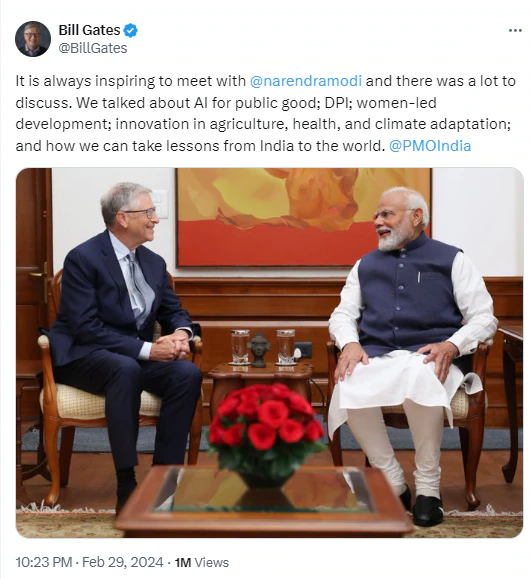 On Thursday, Bill Gates, a co-founder of Microsoft, met with prime minister Narendra Modi in New Delhi. Among other topics, Gates claimed to have discussed with the prime minister Artificial Intelligence, women-led development, innovation in agriculture, health, and climate adaptation, as well as sharing India's lessons with the rest of the world. Gates posted on X, saying, "It is always inspiring to meet with @narendramodi and there was a lot to discuss."