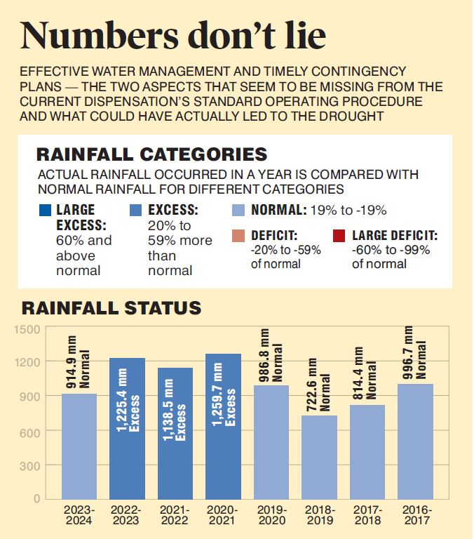 In meteorological parlance, a deficit rainfall occurs when the amount of precipitation reported falls between 20 and 59 percent short of the average amount. In 2023–2024, Telangana—which had only seen below-average rainfall three times in the previous nine years—recorded 5.4% higher rainfall than usual. This begs the question of why chief minister A revanth reddy took a hard stance on providing farmers with water while claiming that the State's drought was caused by "deficit rainfall."