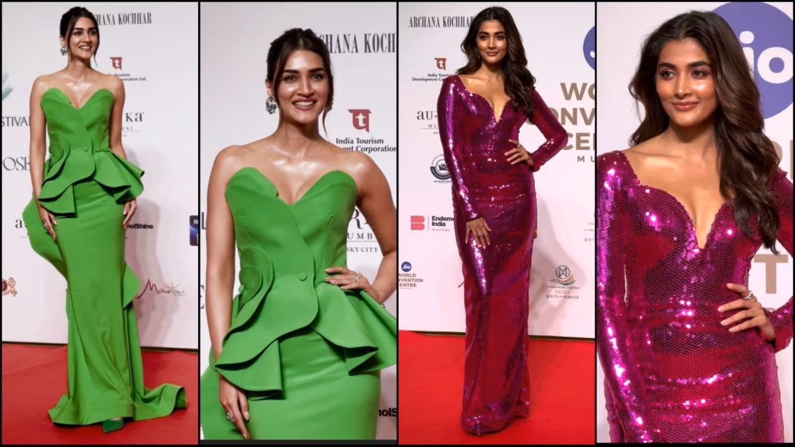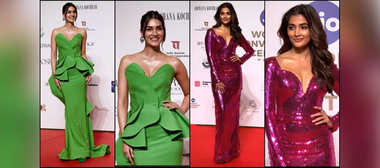 Pooja Hegde looks stunning in a bright pink gown at the Miss World finals, exuding elegance and beauty. Her dress has a maxi skirt, long sleeves, a body-hugging shape, a plunging sweetheart neckline, and a striking magenta-pink color. The complete costume is adorned with a dazzling pattern that adds an extra touch of glitz and refines her appearance.