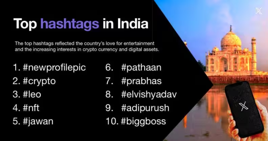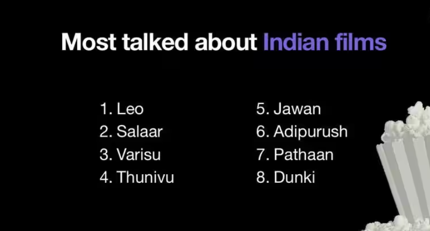 Prashant Neel's prabhas starrer Salaar takes the second place in this list. After that, actor Ajith's Thunivu is in fourth place. Similarly, Shah Rukh Khan's three films jawaan, Pathan, and Dungi, which were released last year, are ranked 5th, 7th, and 8th respectively. Adipurush, Prabhas's blockbuster film, has got the 6th position. Apart from that, they published the top 10 list of most used hashtags on twitter in india last year. The hashtag #newprofilepic has topped it. After that, the #Crypto hashtag got the second place. After that, out of the remaining 8 places, 6 places are occupied by hashtags related to entertainment.In that category, the hashtag of the film Leo, starring actor Vijay, has taken the 3rd place. After that, the hashtags of Shah Rukh Khan's movies jawaan and Pathan have been ranked 5th and 6th respectively. Prabhas's hashtag is in 7th place and Adipurush's hashtag is in 9th place. Finally, the 10th place goes to the entertainment show bigg boss hashtag.