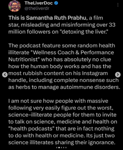 She has been criticized by a doctor for saying that consuming the dandelion plant can cure liver problems. Actress samantha is currently discussing myositis through a YouTube channel. He talks about how the effects of myositis, an inflammatory disease of the muscles, cured it and how he faced the challenges in her personal life. In this situation, samantha talked about keeping the liver healthy in this recently released series. A nutritionist also joined her in this video. In this video, she said that eating dandelion is good for liver health.A doctor has strongly condemned the views expressed in this video on his instagram page. He also slammed samantha and the nutritionist who spoke to her. In his post, he said, “he doesn't know how celebrities with so many followers go and add the wrong people. How can they talk about medicine and health with someone who knows nothing about the body? This person who is talking to samantha is speaking without realizing how ridiculous a comment he is making. This person is spreading the word on her instagram page that he can cure muscle inflammation by using herbs.Dandelion is one of the legumes. Most people think of it as a wild plant. It is usually eaten with salad. In this video, Samantha's consultant talks about how dandelion can cleanse the liver. But no such proof has been proved. The medical benefits of dandelion have not yet been fully explored. We have some data based on research done on animals. In such a situation these plants should not be recommended to humans for medicinal purposes,” he said.