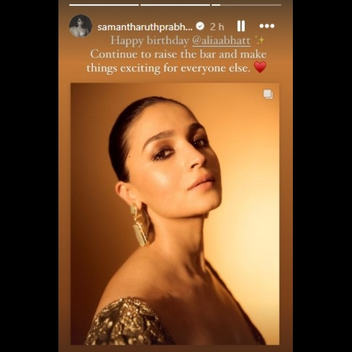 Alia Bhatt has developed over the years from a promising actor to one of the greatest in the business. She is currently one of the most well-known actresses in the nation thanks to her tireless work ethic, exceptional acting ability, and consistent selection of fantastic scripts. In a heartfelt birthday greeting, samantha conveyed her best wishes to alia bhatt on her 31st birthday. "Continue to raise the bar and make things exciting for everyone else," samantha said in a birthday greeting for alia that she shared in a post about her journey.