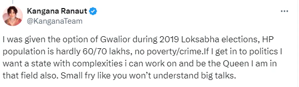 "I was given the option of gwalior during 2019 loksabha elections, hp population is hardly 60/70 lakhs, no poverty/crime.If I get in to politics I want a state with complexities, I can work on and be the queen I am in that field also. Small fry like you won’t understand big talks," she said in the tweet dated march 17, 2021.