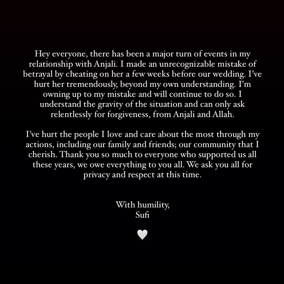"I made an unrecognisable mistake of betrayal by cheating on her a few weeks before our wedding. I've hurt her tremendously, beyond my understanding. I am owning up to my mistake and will continue to do so. I've hurt the people I love and care about the most through my actions, including our family and friends; our community that I cherish," Sufi wrote in her instagram post.