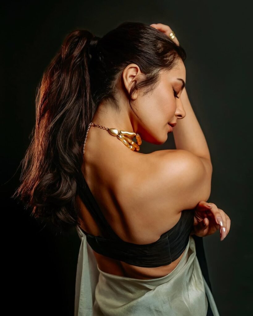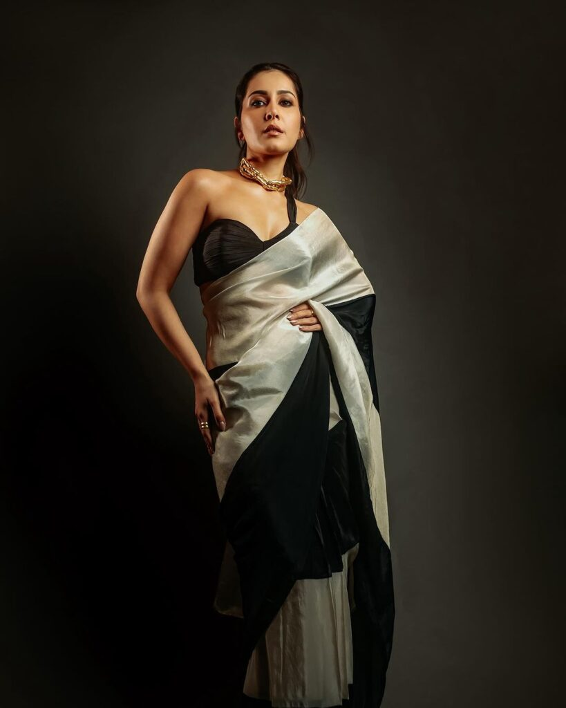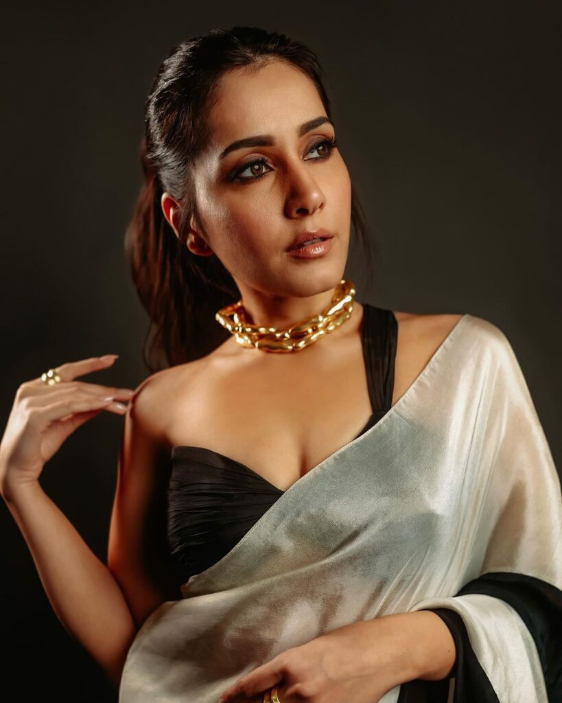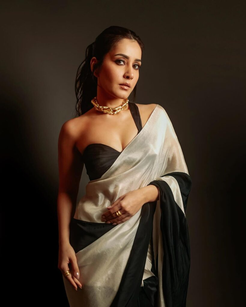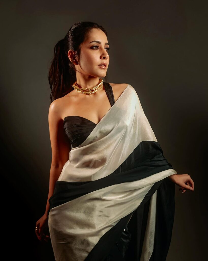 In a recent picture session, Raashi Khanna attracted attention by dressing in a gorgeous black and white saree. Her form was shown in a dazzling light as the saree elegantly enveloped her curves. She went for a one-handed blouse that showed just enough flesh to give it a little oomph. A high ponytail directed attention towards her face and beautiful cosmetics, while a golden necklace provided a hint of elegance. Her features were emphasized by the orange lipstick, matching eyeliner, and mascara, which made her seem hot.
