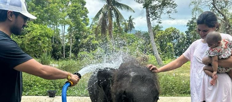 At the elephant rescue camp, I learned so much, #bestdad. The image showed ram charan dousing a young elephant with water with a pipe in his hand, and upasana holding her gorgeous daughter Klin Kaara while maintaining her hands on the animal and seeing it with grace.