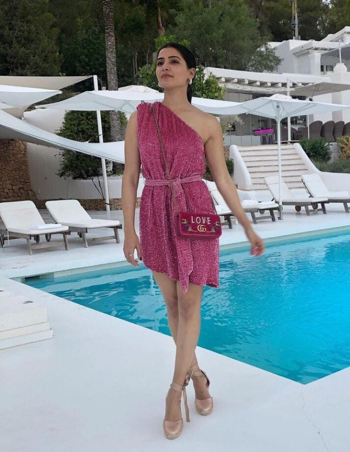 Samantha Akkineni, on the other hand, really upped her glamour game. The actress donned a bright pink outfit with glitter on one shoulder. Similar to Pooja's outfit, hers reached her mid-thigh. There was a pink belt included with the garment. Cream ankle strap heels helped her accessorize the ensemble. She also opted to wear a glam purse and little earrings as her only accessories. Her hair was tied back in a short ponytail, and she wore minimal makeup.
