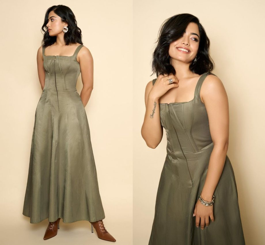Rashmika Mandanna's olive-grey gown oozes style. The dress's olive-grey color lends an air of refinement, and Rashmika's collarbones and neckline are elegantly accentuated by the strappy square neckline. The sleeveless style draws attention to her arms and shoulders and gives the whole look a sleek, contemporary feel. Rashmika's shape is accentuated by the dress's corset front black zip-closure bodice, which cinches her waist and draws attention to her curves. With every stride she makes, the flared ankle-length skirt gives movement and drama to the ensemble while exuding elegance and grace.