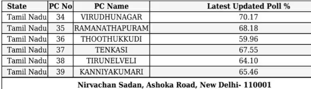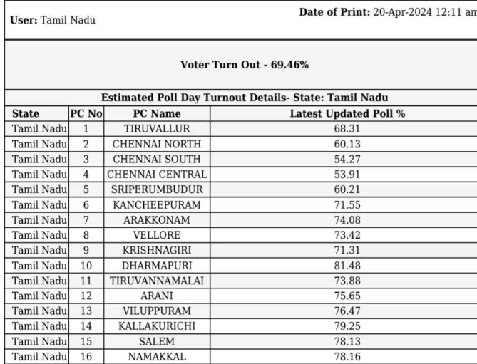 In the 2019 lok sabha elections, the voter turnout was 72.4 percent, while this time, only 69.46 percent of votes were cast. This is confirmed by the figures released by the election commission at midnight today. In tamil Nadu, 12.55% of votes were cast as of 9 am, 24.37% as of 11 am, 40.05% as of 1 pm, 51.41% as of 3 pm, and 62.02% as of 5 pm. A total of 69.46% of the votes were registered in Tamil Nadu, the highest was 81.48% in Dharmapuri constituency and the lowest was 54.27% in South Chennai. 64.54% voter turnout has been recorded in the by-election in Valavankot. Generally, polling in all three constituencies of chennai is low. Although the votes in chennai are low compared to other constituencies, political observers have opined that this election has recorded the highest number of votes in all three constituencies since 1980. Although this cannot be said to be the best vote percentage, it is definitely a victory worth celebrating. However, this has been reported on social media but no one has confirmed it.