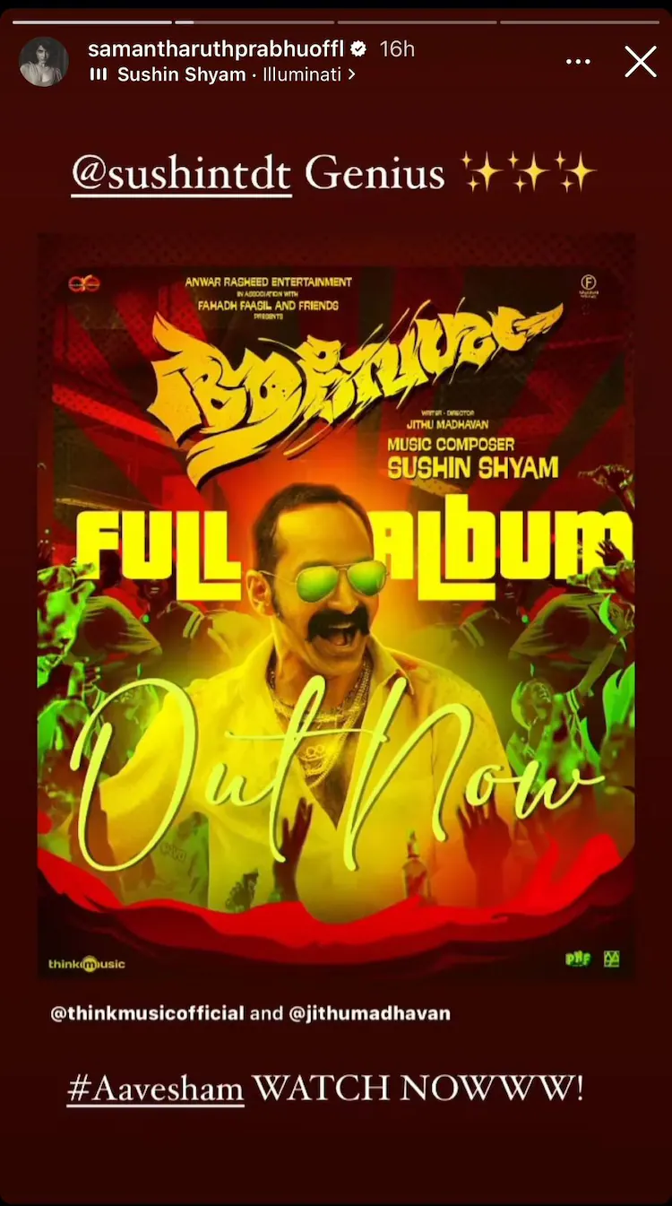 Samantha posted a picture of herself with her cat, Gelato, on Instagram. With three heart emojis, she wrote, "#Aavesham hangover (sic)," as the description for the picture. 'Illuminati' is another song she posted. She also shared the poster of 'Aavesham' and appreciated Sushin Shyam's music. She then urged everyone to watch the film as soon as possible. Her caption read, "@sushintdt Genius. #Aavesham watch NOWWW! (sic)."
