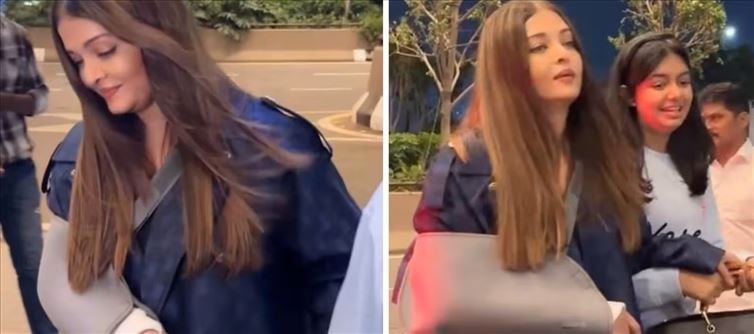 Aishwarya was seen stepping out of her car with her daughter Aaradhya in a video that was recorded and posted on instagram by a paparazzi account. The performer's right arm was in a sling, and her wrist was covered in a white cast. She wore a black dress and an unfastened blue coat that hung down to her knees. Aaradhya was dressed in black trousers and a bright blue sweatshirt. After giving the journalists a little wave, aishwarya arrived at the mumbai airport.