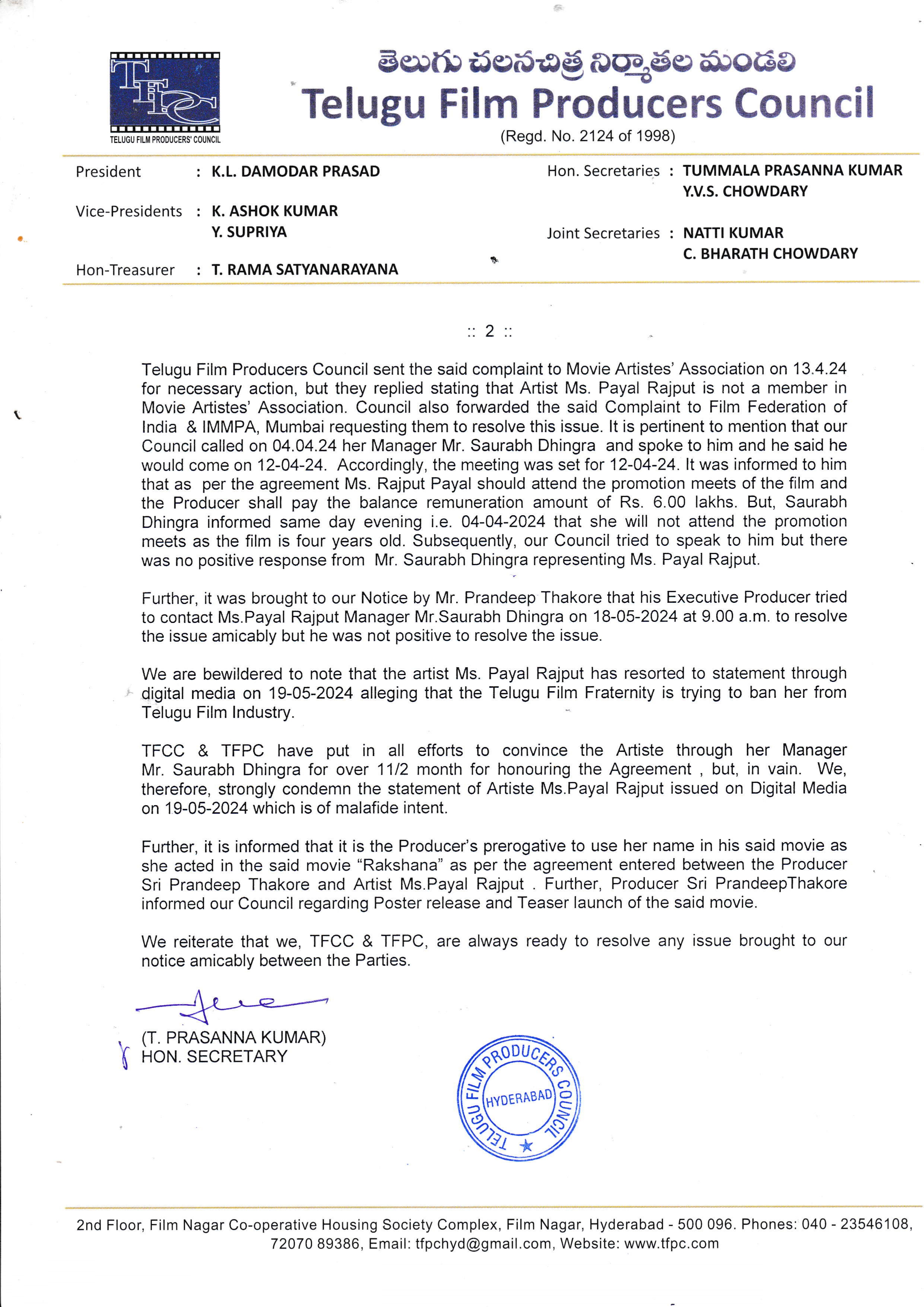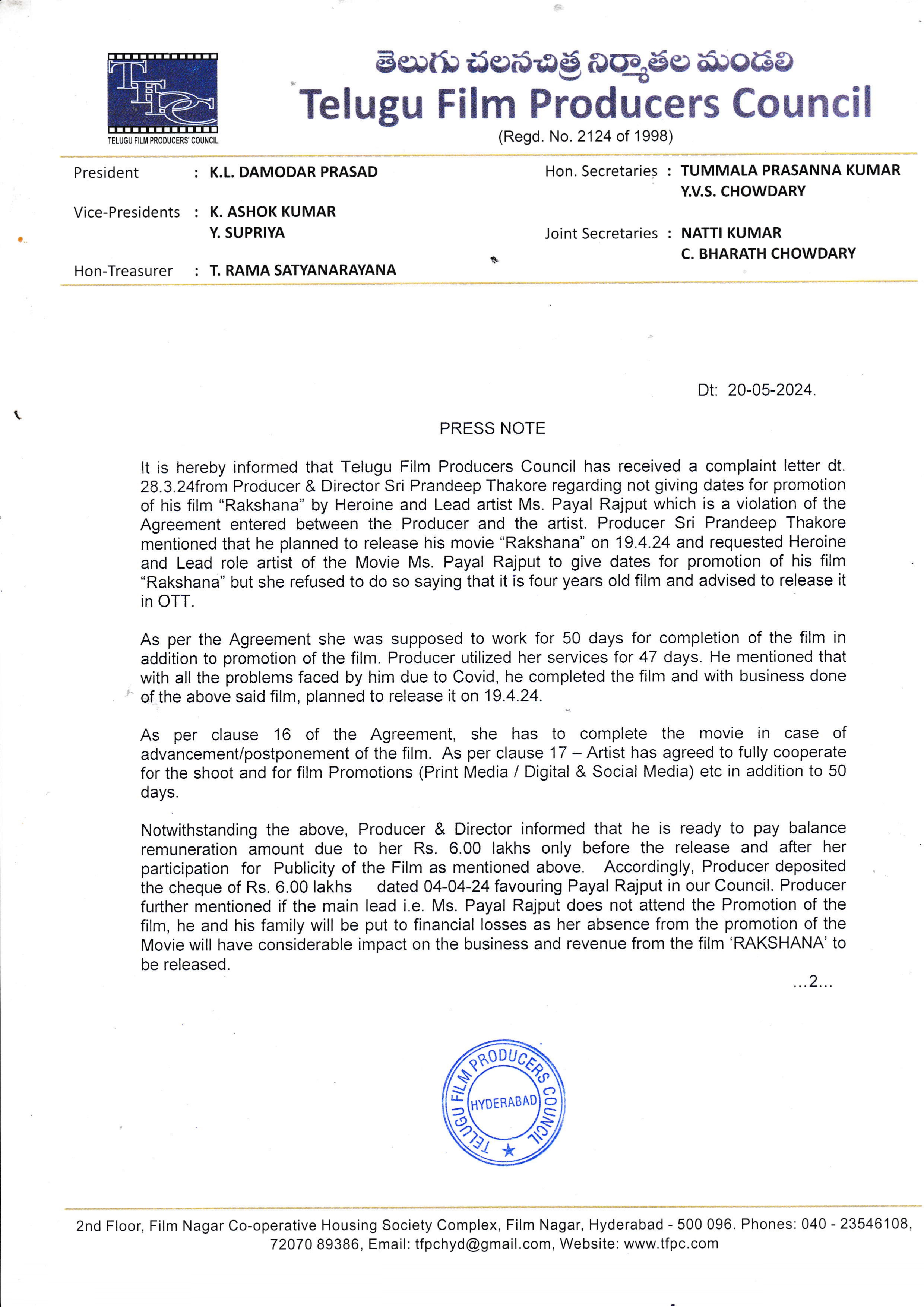 Payal Rajput complained on social media yesterday about her film 'Rakshana,' which she shot in 2019 and 2020, but the producer is now insisting that she market it. She said the producer had not processed her payment and had used improper language, prompting her to explore legal action. Now, Sri Prandeep Thakore, the producer and director of the film 'Rakshana,' has filed an official complaint with the telugu Film Producers Council.