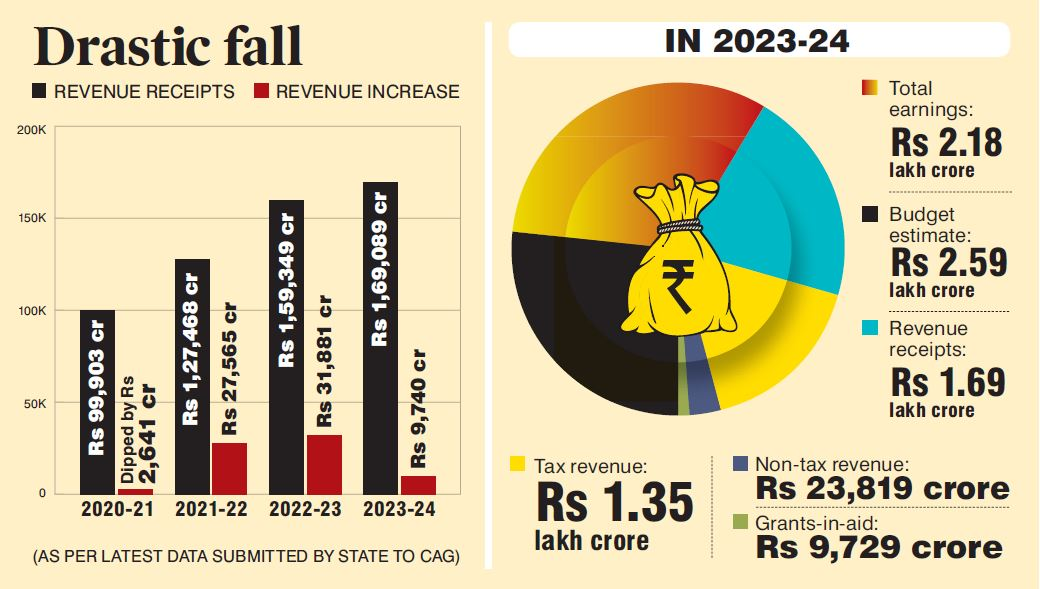 The income rise for the fiscal year 2023-24 is the lowest in the last four years, since in 2020-21, beset by the economic crisis caused by the Covid-19 outbreak and subsequent lockdowns, the State's revenue fell by Rs 2,641 crore compared to the previous financial year.According to the most recent statistics presented by the State government to the Comptroller and Auditor General (CAG), telangana earned Rs 2.18 lakh crore in total, compared to the budget projection of Rs 2.59 lakh crore. income collections were Rs 1.69 lakh crore, which included Rs 1.35 lakh crore from tax income, Rs 23,819 crore from non-tax revenue, and Rs 9,729 crore from grants-in-aid.