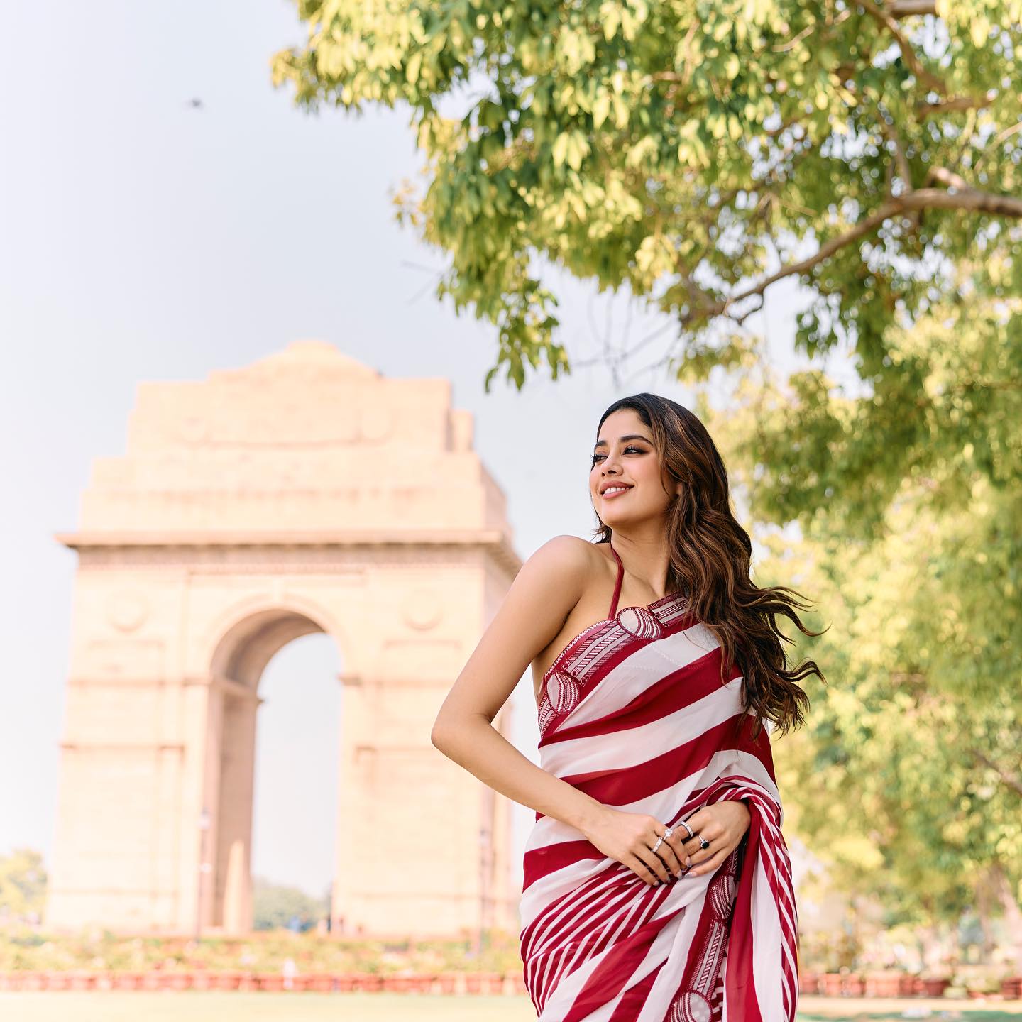 Her choice of accessories gave just the proper amount of glitter to her look. Janhvi avoided bulky accessories in favor of ruby and diamond earrings and rings. She arranged her hair in lovely curls.