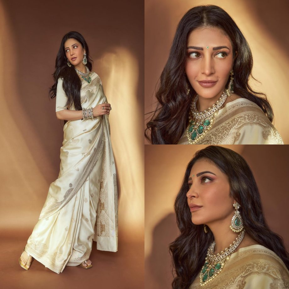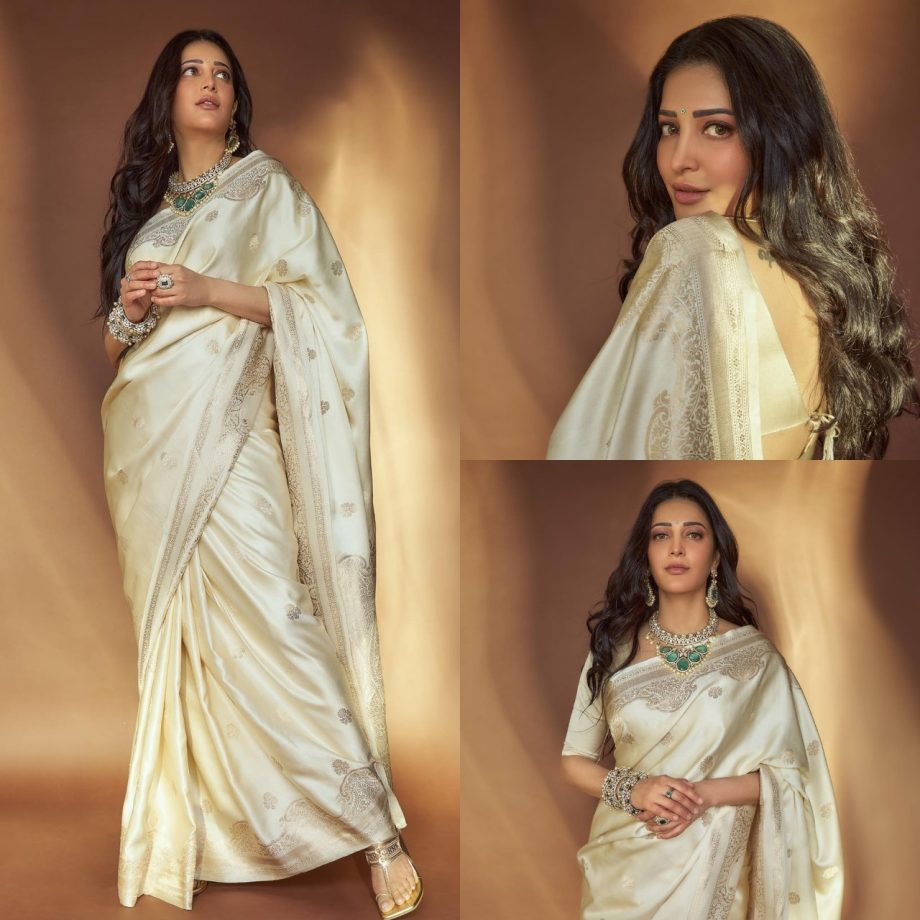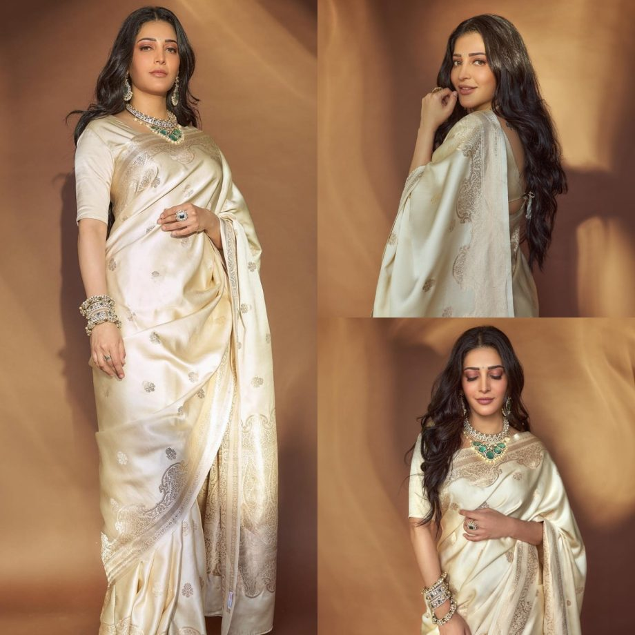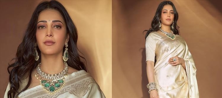 The beauty shruti Haasan is a well-known actress in the entertainment business. She is well-known in the Southern film business. Aside from her incredible performance talents, the diva is well-known for her fashion choices at events, gatherings, parties, and other settings. Her simple yet charming look has always impressed her followers. Take a look at shruti Haasan's ethnic cream silk Banarasi saree.