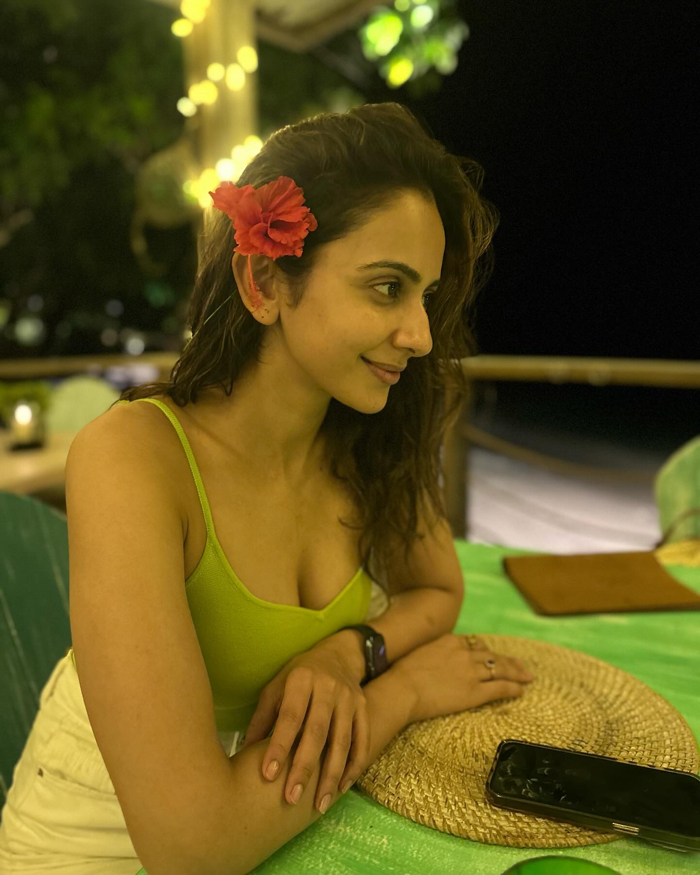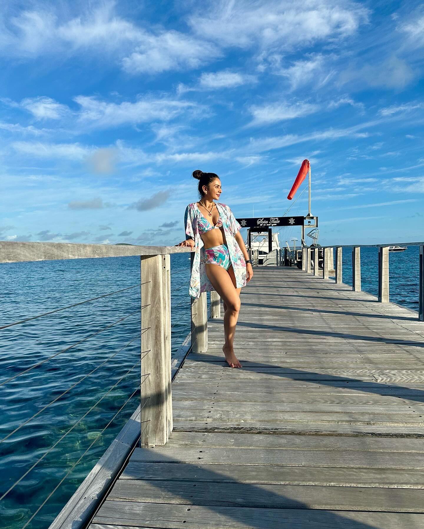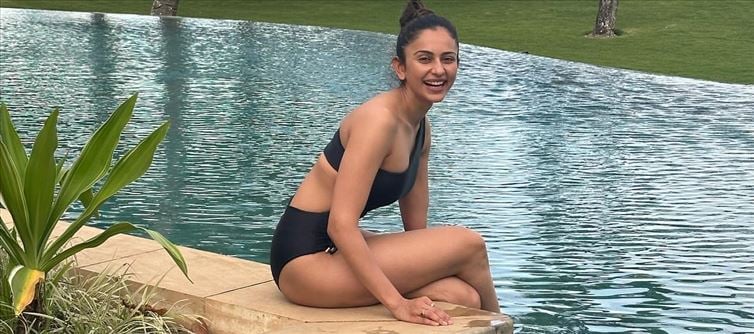 Rakul Preet Singh is now vacationing in the fiji Islands, and her lovely ensembles are worth including in your summer collection. rakul picked a variety of ensembles, including swimwear and patterned maxi dresses, that are ideal for a beach day and will keep you safe whether you're sitting by the pool or enjoying the waves at the beach. Rakul Preet looks gorgeous in the La Paz black bikini. Her dress has a perfect fit, a distinctive asymmetric neckline with soft padding on the bust, and tie-up details at the waist and shoulders. For her second look, she dressed casually in a black top and white shorts. Her final style includes a white shirt, baseball hat, and round sunglasses. Rakul donned two distinct clothes in this photo shoot. One shows her in a pale green bodysuit with butter-yellow pants. One year, she kept her style basic, wearing a wristwatch and a flower tucked behind. She opted for the opposite style with a layered halter maxi dress by Guapa. The dress is composed of chiffon and has cushioning at the bust, a halter neckline, braided straps, cascading layers, and a floor-length hem. She finished the ensemble with pink flip-flops, gold hoops, and a crochet purse. Rakul Preet Singh is shown sporting a KAI Swimwear tropical patterned bikini suit. Her outfit consists of a bralette with a plunging v neckline, a high-waisted bikini bottom, and a short shrug. All three items have printed leaves in aqua, orange, and pink tones. A lovely necklace with pink stone completed her outfit. Her costume is ideal for lazing by the pool or catching waves on the beach.Rakul wears two clothes in this video. rakul displays a calm feel in her first appearance, wearing a black t-shirt and light blue jeans with golden earrings. Meanwhile, another look has a yellow crop top, blue jeans, and brown flats.