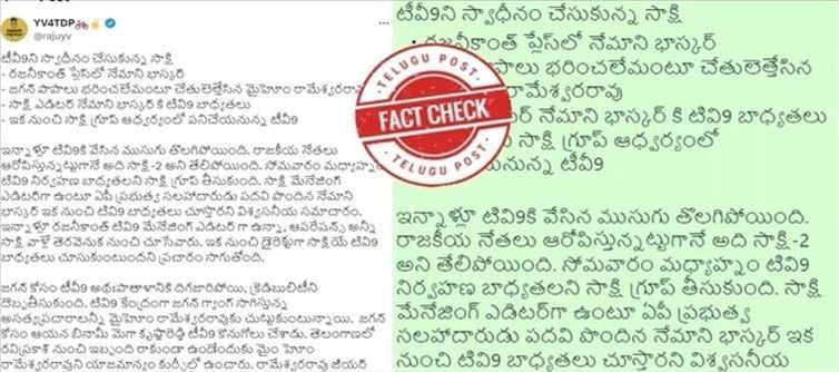 From the last few days, various rumors are being created about the tv9 Telugu media house. tv9 network is also well spread in other languages. Especially, the tdp leaders are spreading misinformation that the management of sakshi TV is taking over TV9. The main reason for this is that this time, tdp leaders have realized that tv9 is slightly supporting the ycp party and they are spreading this misinformation.