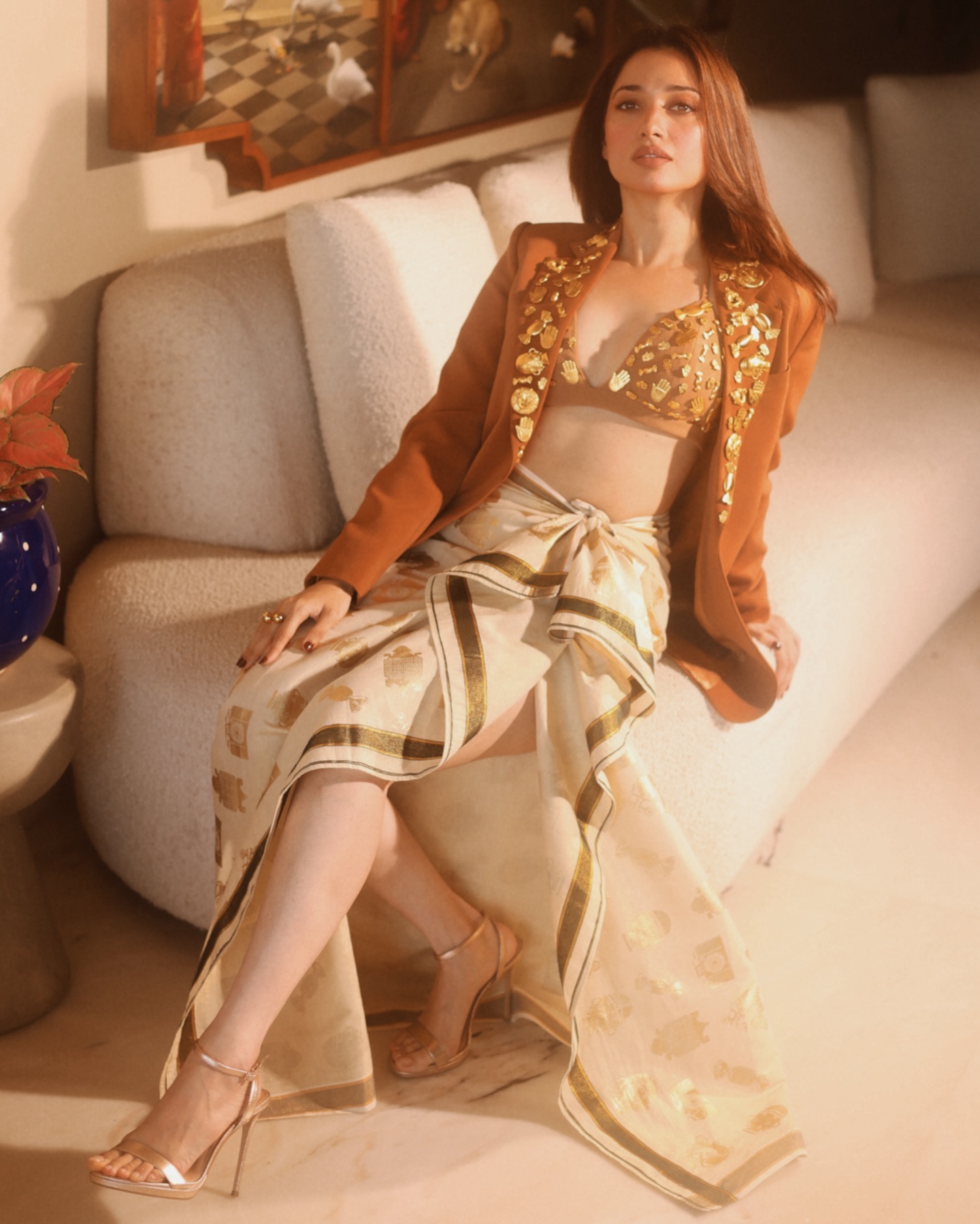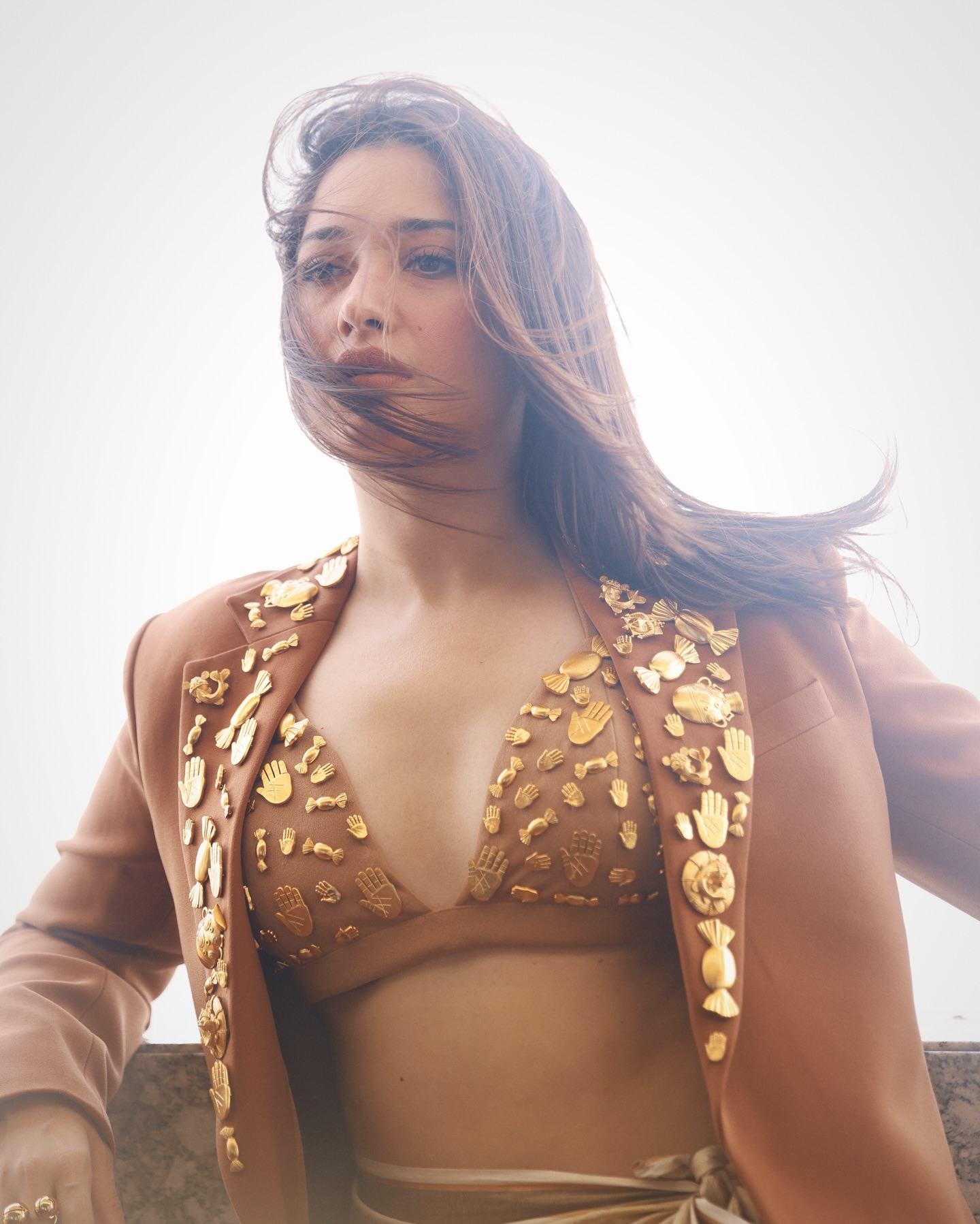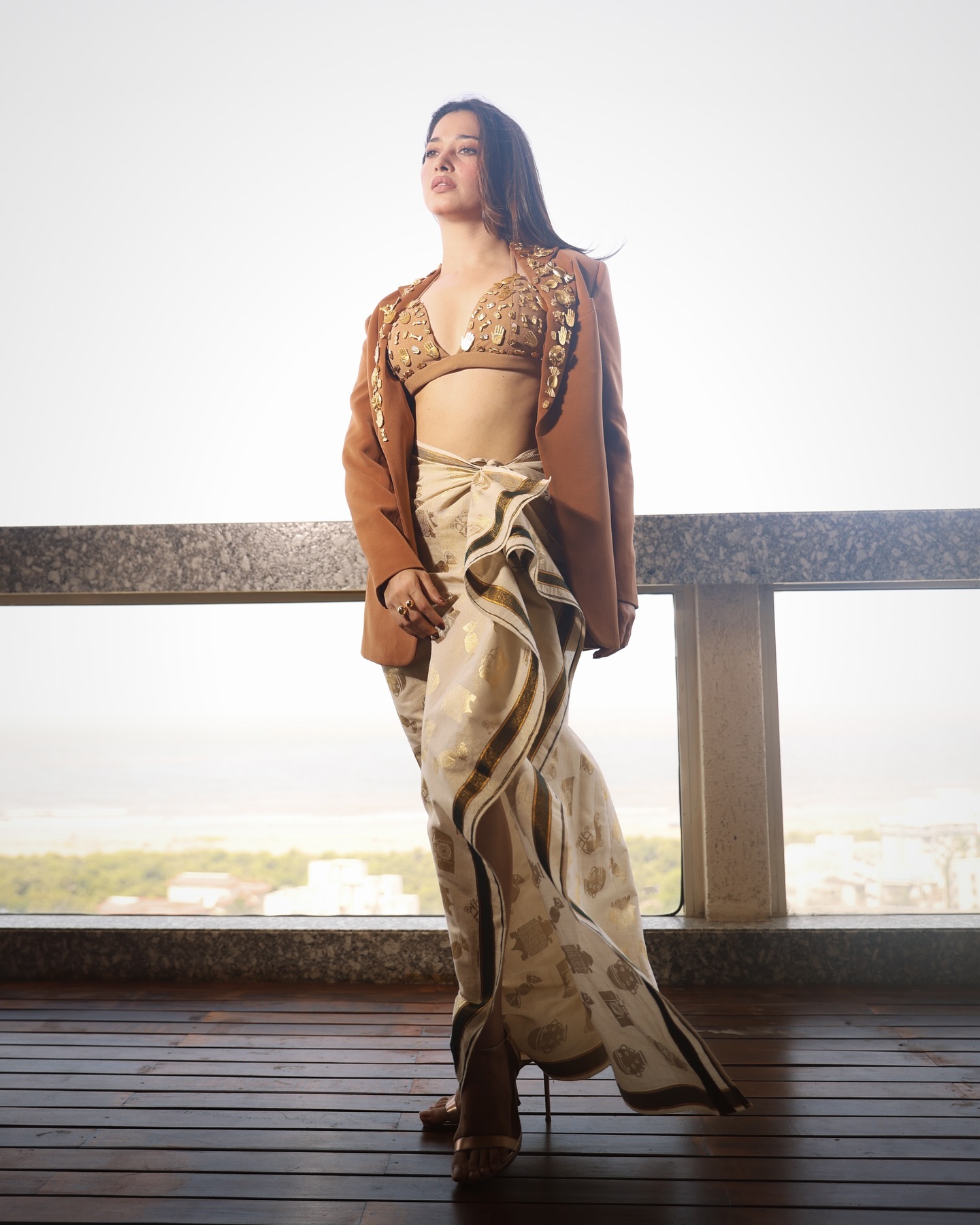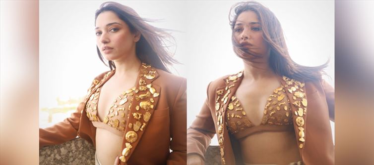 Tamannaah Bhatia stole the show with an ensemble straight from the shelves of house of Masaba, and it's nothing short of amazing. Her stunning costume includes a brown bralette with a plunging neckline that highlights her décolletage.