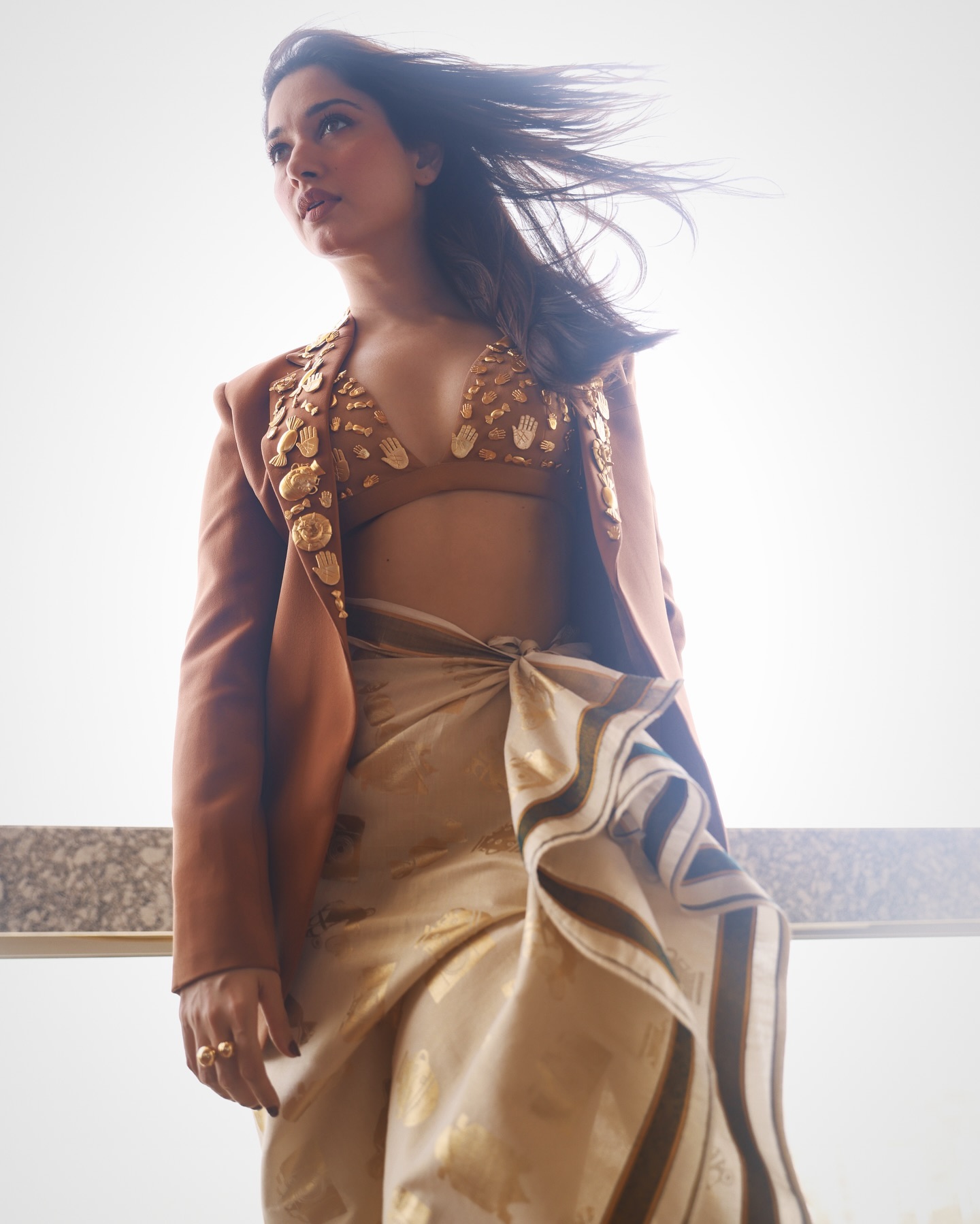 To complete the outfit, the Bholaa shankar actress wore a flowing, silky beige sarong skirt with a hint of casual elegance. The uneven hemline and waist knot added movement and visual interest to the skirt. The skirt featured modest golden designs throughout, which complemented the blazer's decorations, tying the entire look together with flair and class.