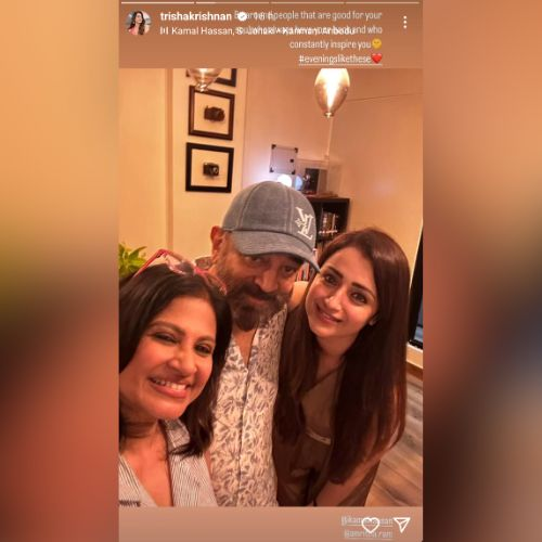 The selfie, taken by Kamal Haasan's personal stylist, Amritha Ram, shows the two actors and the stylist. While vikram looked casual in a patterned shirt and a hat, trisha krishnan wore a more traditional olive green suit. The actress uploaded a photo with the caption: “Be around people that are good for your soul, who always have your back and who constantly inspire you #eveningslikethese”
