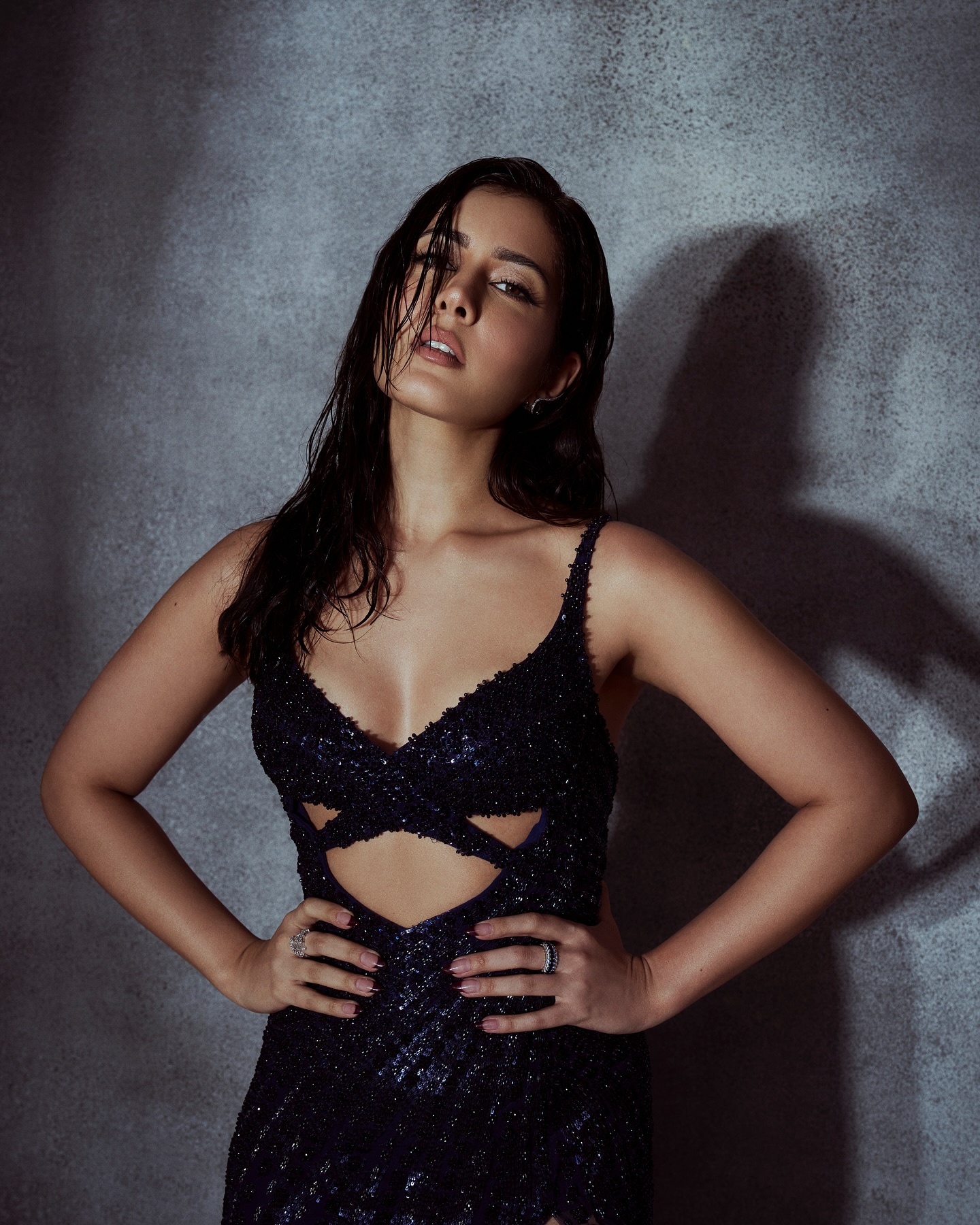 The actress stunned her admirers by sharing photographs from her photo shoot wearing this outfit. The diva looked stunning in a sparkly navy blue gown with a daring low neckline that made an impressive appearance. Her outfit's standout piece was the fitted bodice with the cut-out design, but the thigh-high slit immediately drew our attention and upped the event's glamour factor.