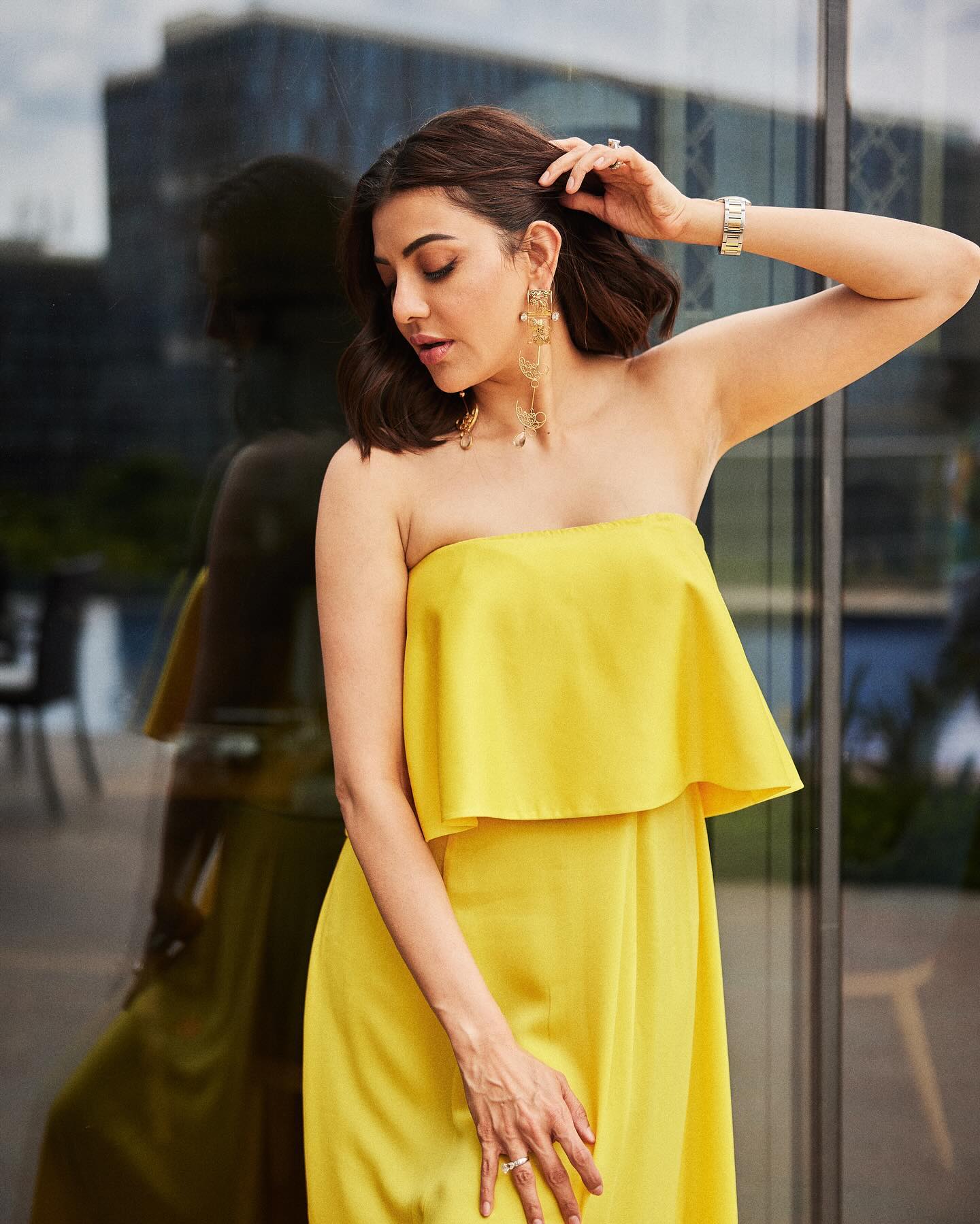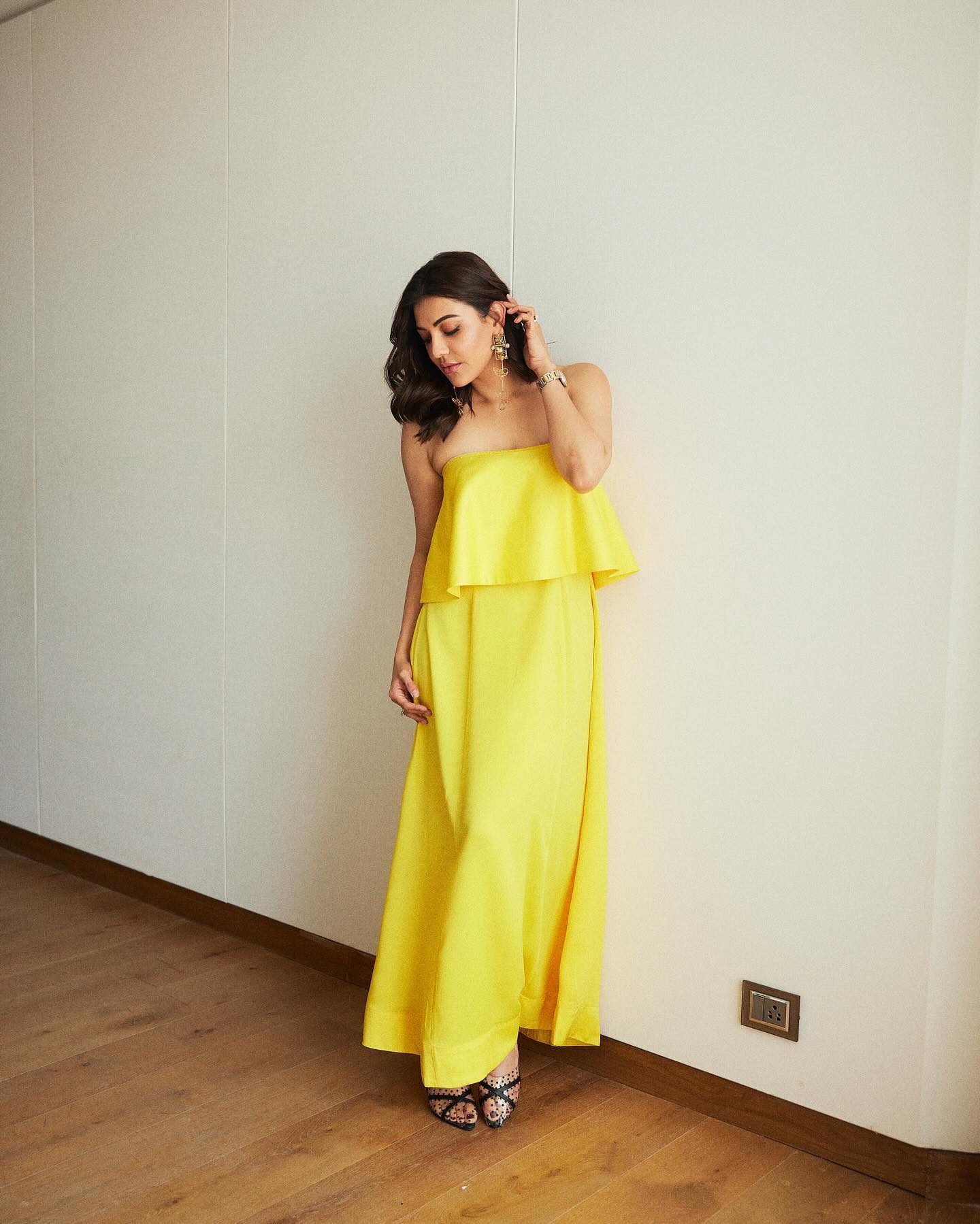 Kajal made an appearance on her instagram picture wearing a gorgeous yellow maxi dress. Her entire ensemble has a glamorous, vivid look. The Real B is the apparel brand that makes the yellow maxi dress. The ensemble features an ankle-length maxi dress with a fitted stomach and a jaw-dropping strapless, tube-style neckline that flares. Her gorgeous shoulders are accentuated by the ensemble, which makes it the ideal pick for your laid-back day out.