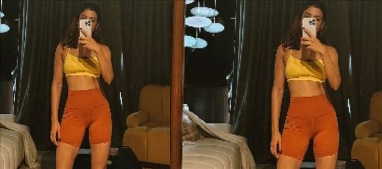 Samantha Ruth Prabhu has a distinctive sense of style. She adds a pop of color to her appearance in her most recent picture by donning a yellow strappy, U-neckline, sleeveless plain bralette. She accessorized her ensemble with brown tight shorts that cinched at the waist, accentuating her toned body and adding to her elegance.