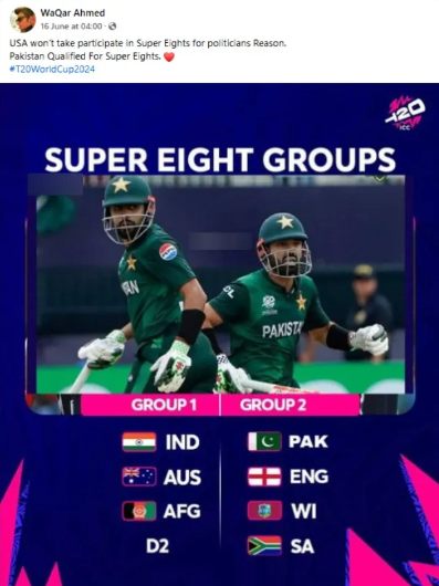 In this situation, teams like pakistan and New Zealand, who were expected to leave in the first round, have shocked the fans of the team. In this situation, a post on the Pakistani website is going viral. The US team will not go to the west indies due to political reasons. It has also been mentioned that the US team has left the series. Due to this, the pakistan team, which is next to the United States, has qualified for the Super 8 round. This has left the Pakistani fans confused. But this is completely wrong information. No such incident has ever taken place. The t20 world cup was held in America to popularize cricket. Now that the US team has qualified for the Super 8 is seen as a historic event, why is the US going to leave? But there have been incidents like this where various teams have pulled out of various sports for political reasons. But no such incident took place in this t20 World Cup. Thus it is significant that it is false. As the 90s kids were deceived that the final match was going to be held again, the Pakistani cricket fans are also being deceived now.