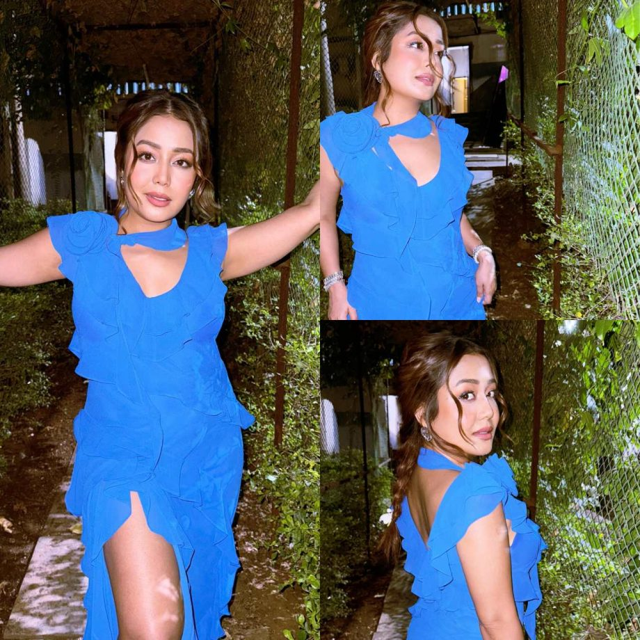 With her stunning body flaunting a blue ruffled dress, Neha redefined hotness in blue. While pooja hegde accessorised it with her own unique flair, he picked out the exact same garment. She was the centre of attention with her thigh-high toned legs. The diva looked stunning in her dazzling blue outfit.