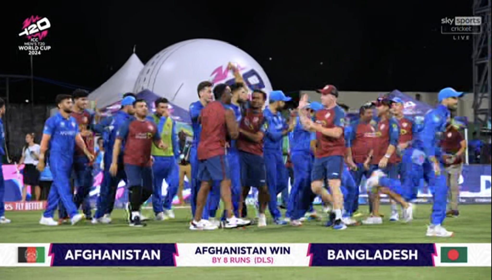 When it comes to the ball, naveen keeps things straightforward: the ball is full and straight to the stumps, Mustafizur is glued to the crease and is smacked on the rear pad, and the ball is smashed into the middle stump. My goodness! Let's all take a moment to relax. What a game we've just watched! The Super 8 stage could not have ended more fittingly. australia was eliminated from the world cup as a result of Afghanistan's semifinal booking. The players from afghanistan are circling the pitch.