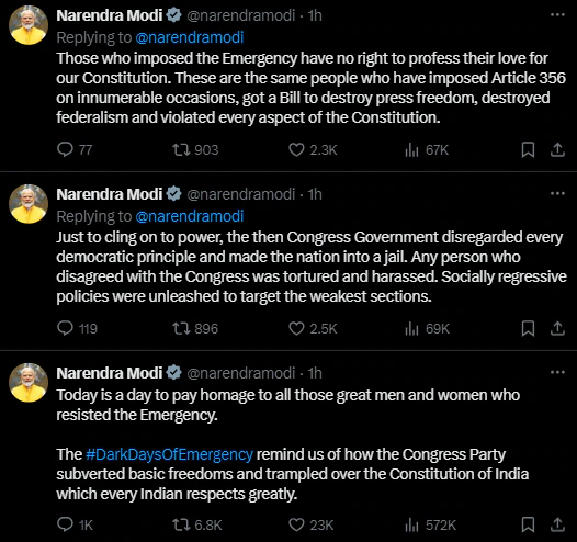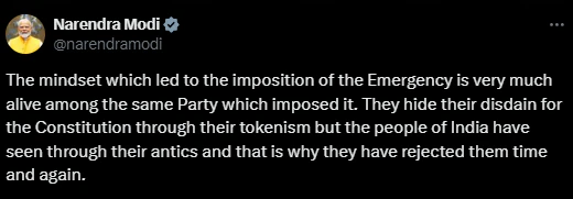 PM Modi mentioned the "dark days" and recalled how the congress "subverted basic freedoms and trampled the Constitution" in a tweet, honouring those who "resisted" the Emergency.
