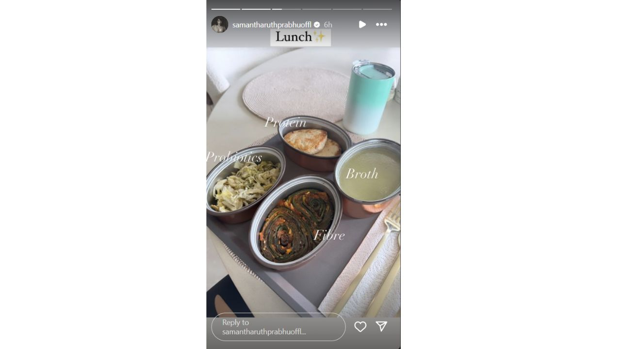 Samantha Ruth Prabhu, a well-known figure in India, keeps her admirers informed on her travels, everyday activities, profound reflections on life, and other things regularly. This time, the family man phenomenon used her instagram Stories to give fans a glimpse into her everyday activities. The actress, who is a fitness enthusiast, debuted the show with a healthy lunch meal that included probiotics, fiber, protein, and broth.