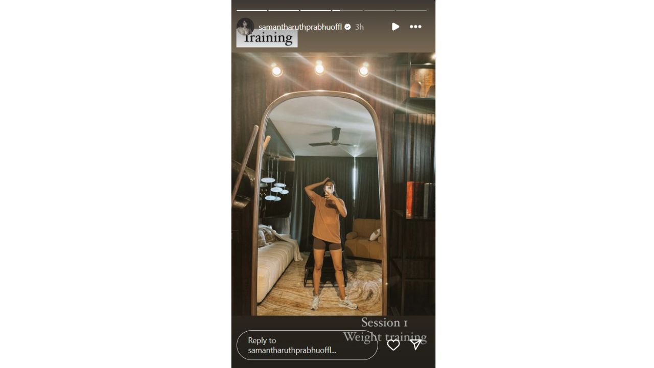 In the next story, the U-Turn actress shared a photo from her weight training session, writing "Training" and "Session 1."