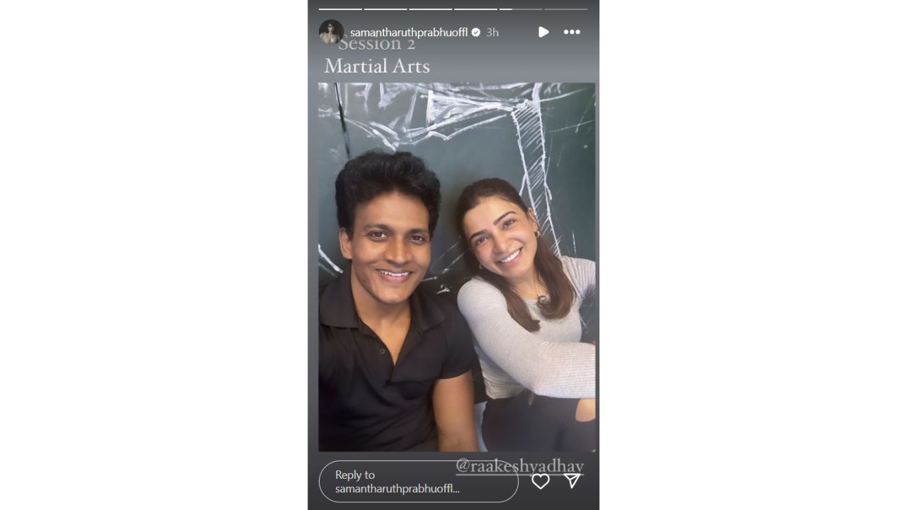 The last story features her in a Martial Arts session with expert and actor Raakesh Yadhav. Posting a photo with him, samantha wrote, "Session 2 Martial Arts." She looked happy and smiling while posing for the photo with Raakesh.