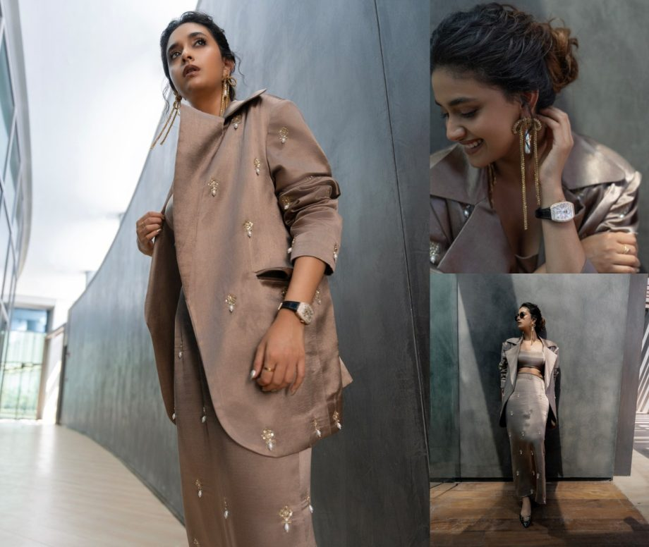 Keerthy displayed her fiery side in fresh images from her most recent picture shoot that she posted to her instagram account. The diva exuded bossiness in her greyish-brown three-piece formal set, which included a matching jacket and a bralette with a high-waisted skirt. She exuded sophistication with her long earrings and wrist bracelet, messy bun hairdo, and flawless makeup. With her commanding demeanor, the actress looked sophisticated in the neutral hue.
