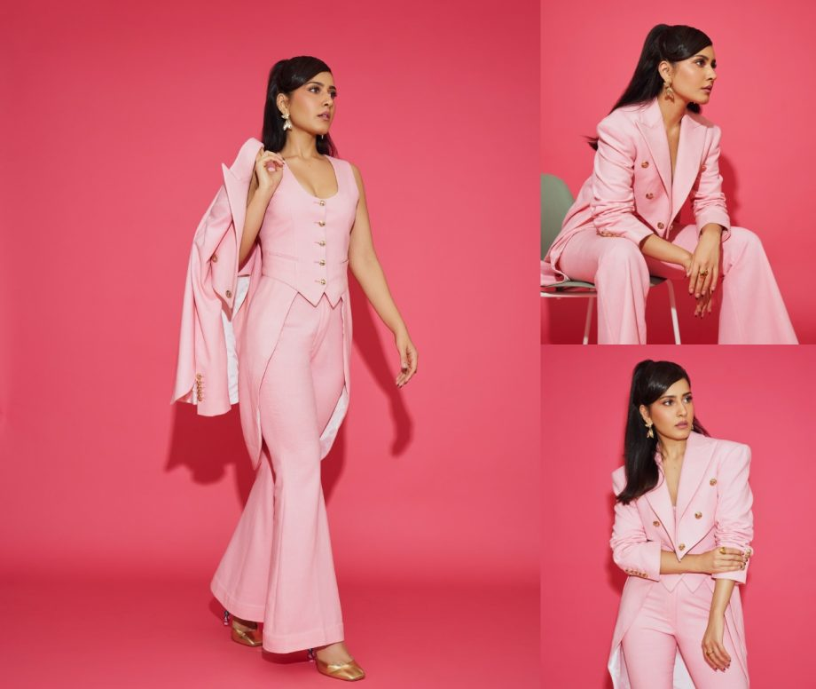 Raashii gave her instagram followers a sneak peek at her most recent photo shoot. The actress, dressed in a pink three-piece formal ensemble, looks stunning in the pictures. The diva exuded superwoman style in her baby pink waistcoat with its low neckline and elongated skirt elements. She looked like a dominating girl when she wore similar flared pants and a stylish jacket. She incorporated a retro look with her side-part high hair, winged eyeliner, pink lipstick, and golden accessories.