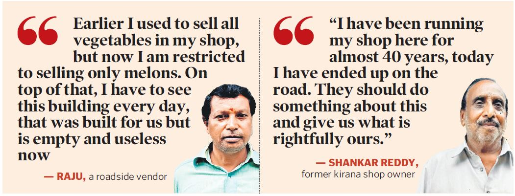 "This is my sole source of income as a single mother. Look at me now, they claimed they would offer us a store in that building. Vegetable vendor Laxmamma bemoans, "I sit here every day and earn an income with which I can barely put food on the table."