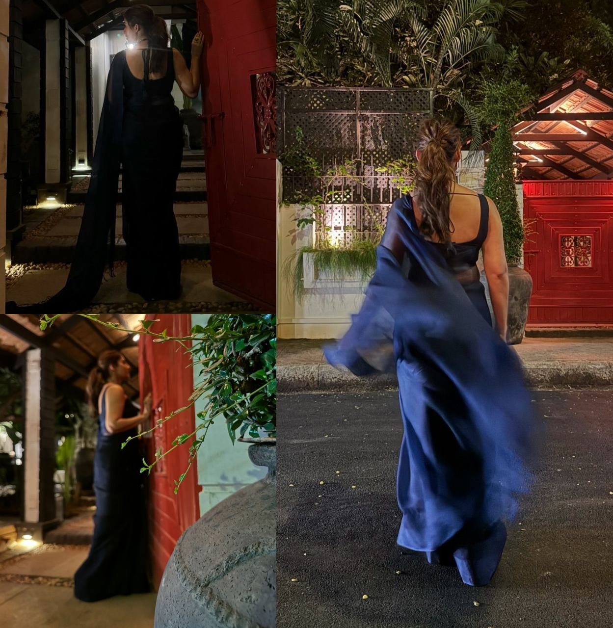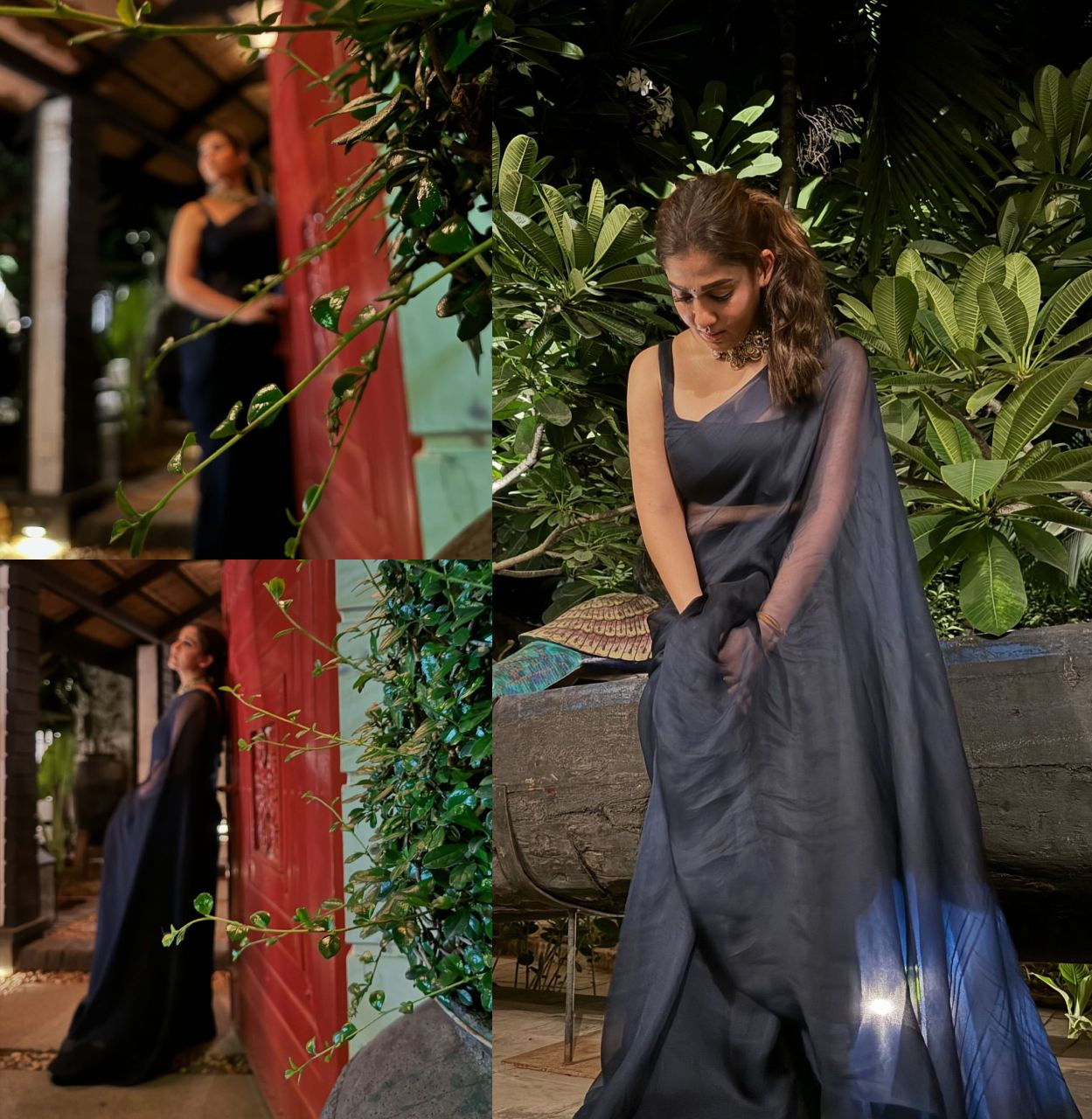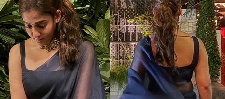 Nayanthara posted pictures of herself on instagram over the weekend while sporting a simple blue saree. The actress attended a local function dressed in this classic elegance. The ensemble has a simple navy blue top with a low round neckline, sleeveless hands design, and jaw-dropping collarbones that showcase her stunning shoulders. She looks confident and elegant when she wears the simple blue transparent saree. Her modest clothing combines a touch of history with modern elegance.