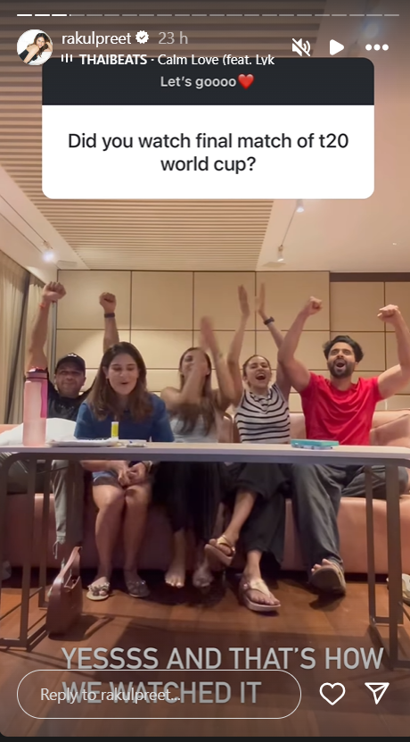 Rakul had a flurry of enthusiasm and pleasure during her Q&A with her followers. rakul posted a time-lapse video to her instagram stories in response to a question about whether she had seen the exciting final game of the t20 world cup between south africa and India. She captioned the video, which showed her and her husband cheering on India's victory, "Yessss and that's how we watched it."