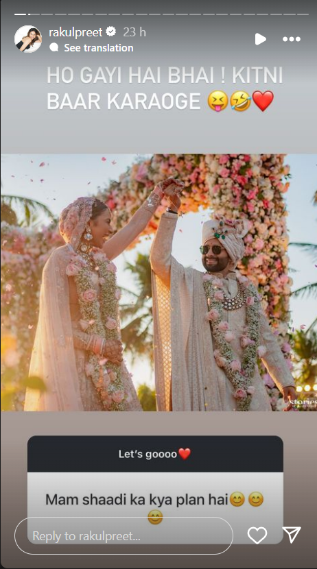 When a fan asked, “Mam shaadi ka kya plan hai (Ma’am, what is your marriage plan?)” during her Q&A session, rakul responded by posting a lively picture from her dreamy wedding with actor Jackky Bhagnani, both dressed in exquisite traditional wedding attires, on her instagram Stories. Not only this, she also added a humourous caption, stating, “Ho gai hai bhai! Kitni baar karaoge (It’s already happened, guys! How many times do you want it to happen?)
