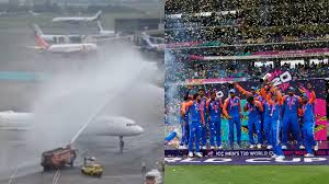 The indian cricket team that won the t20 world cup has been given the honor of a water cannon salute. After 17 years rohit sharma led the indian team to win the t20 World Cup. india beat south africa by seven runs in the final to win the title. The indian team has now landed at the mumbai airport. The indian cricket team, which met prime minister Modi in delhi this morning, has now reached mumbai by Vistara flight. The indian Players have given a water salute to the players who came to Mumbai. A water salute is when the aircraft lands on the runway and water is sprayed from both sides of the aircraft from the vehicles lined up and parked there. Such an honor has been given to the indian cricket team. This is usually done when a pilot retires to recognize his service and honor him. This type of honor is given when any Head of State lands by plane. Such an honor is currently bestowed upon the players of the indian team. The bcci has conferred this honor on virat kohli and rohit sharma Jadeja for winning the t20 world cup and retiring from international cricket. After that, the indian team landed at the mumbai airport. The stars that shone at night were honored by the officials by giving them a bouquet of flowers. The players were escorted to safety amid a crowd of fans. At that time, the fans were competing to take a selfie with the players. After this, the players will now be brought in a luxury bus and will go to Marian Drive.