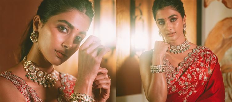 Pooja Hegde's most recent social media post is the definition of elegance! Wearing a stunning crimson saree with embroidery, pooja exudes attractiveness. The saree's elaborate embroidery gives it a grandiose touch, and the matching sleeveless blouse completes the ensemble flawlessly.