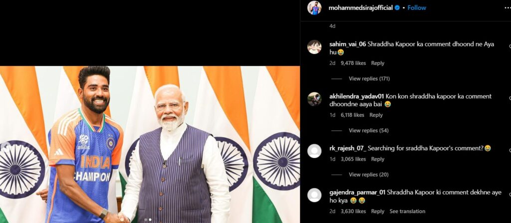 Fans flocked to Siraj's official instagram account after seeing the viral video, anxiously awaiting Shraddha Kapoor's response. people on social media were humorously questioning, "Kon kon Shraddha Kapoor ka comment dhoondne aaya hai?," as the platform was ablaze with humour and curiosity. (Who is here in search of Shraddha Kapoor's response?)
