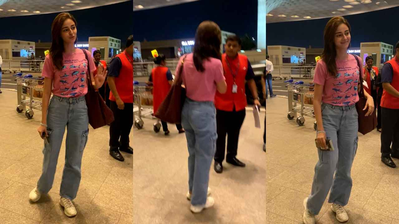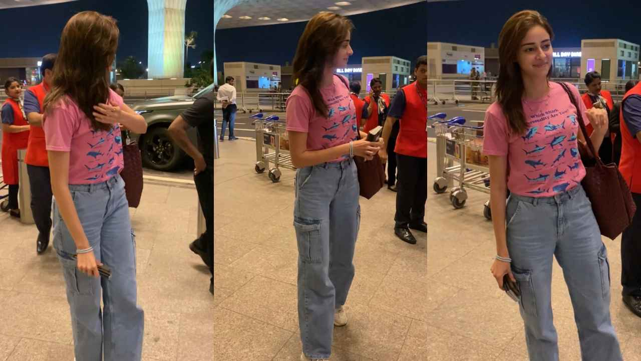 Ananya Panday has always had a strong affinity for minimalism. Her stylish choices always make an impression, particularly when she's at the airport. Her most recent outfit was no different. The dream girl 2 actress successfully combined snark and a Gen-Z-approved look to provide comfort. She wore a cute half-sleeved pink T-shirt with a blue shark image contrasted on it. At just Rs. 3,530, this trendy t-shirt from Urban Outfitters is reasonably priced.