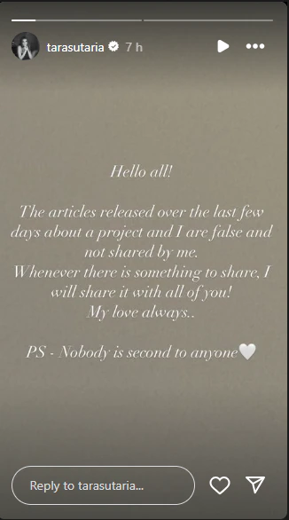 "Hello all!" is what tara sutaria wrote on Instagram. The items that have been published in the past several days regarding a project and me are untrue and were not shared by me.  She went on to mock the speculation that she was chosen to play the "second" female lead, saying, "I'll tell you all I have whenever I have anything to give! Always, my love. PS: No one is subordinate to anybody.
