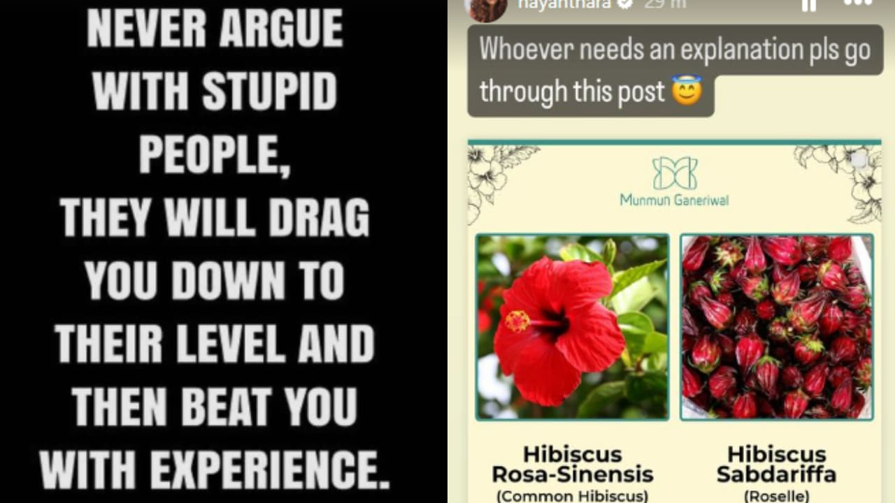 In the post, Nayanthara had asserted that hibiscus tea can help with diabetes, high cholesterol, high blood pressure, and heart-related ailments. A few hours after removing her post, she shared a cryptic note quoting Mark Twain. The post read, "Never argue with stupid people. They will drag you down to their level and then beat you with experience." She also shared a post on hibiscus by her nutritionist Munmun on her instagram stories and wrote, “Whoever needs an explanation pls go through this post.”
