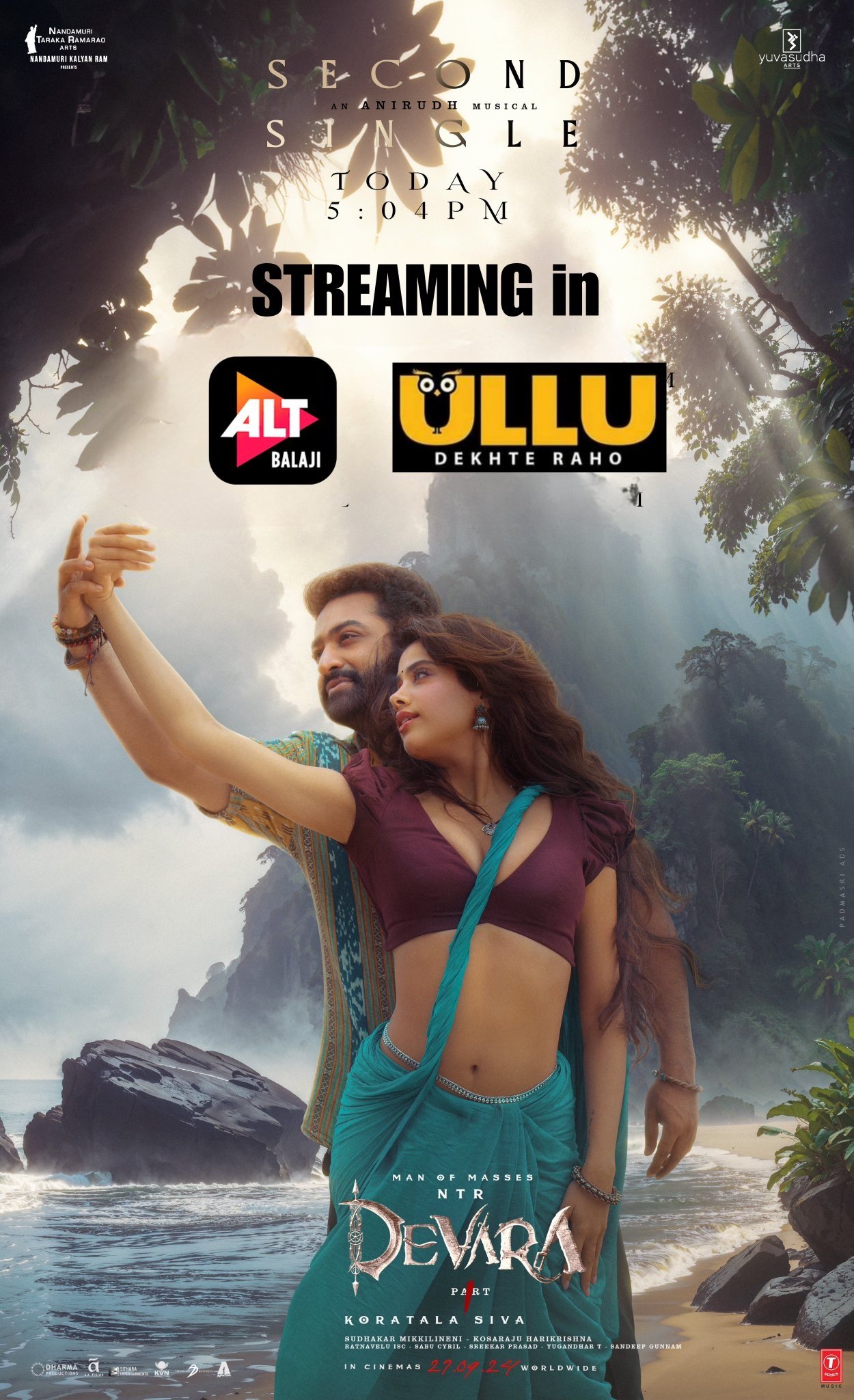 Jr. ntr and janhvi kapoor will soon appear in a film together in Devara. Before it opens, there has been a lot of buzz about the movie. The film's second track, nevertheless, will be released by the creators today. They released a poster of Janhvi and jr ntr adopting a romantic stance to heighten the anticipation, which has their fans giddy.