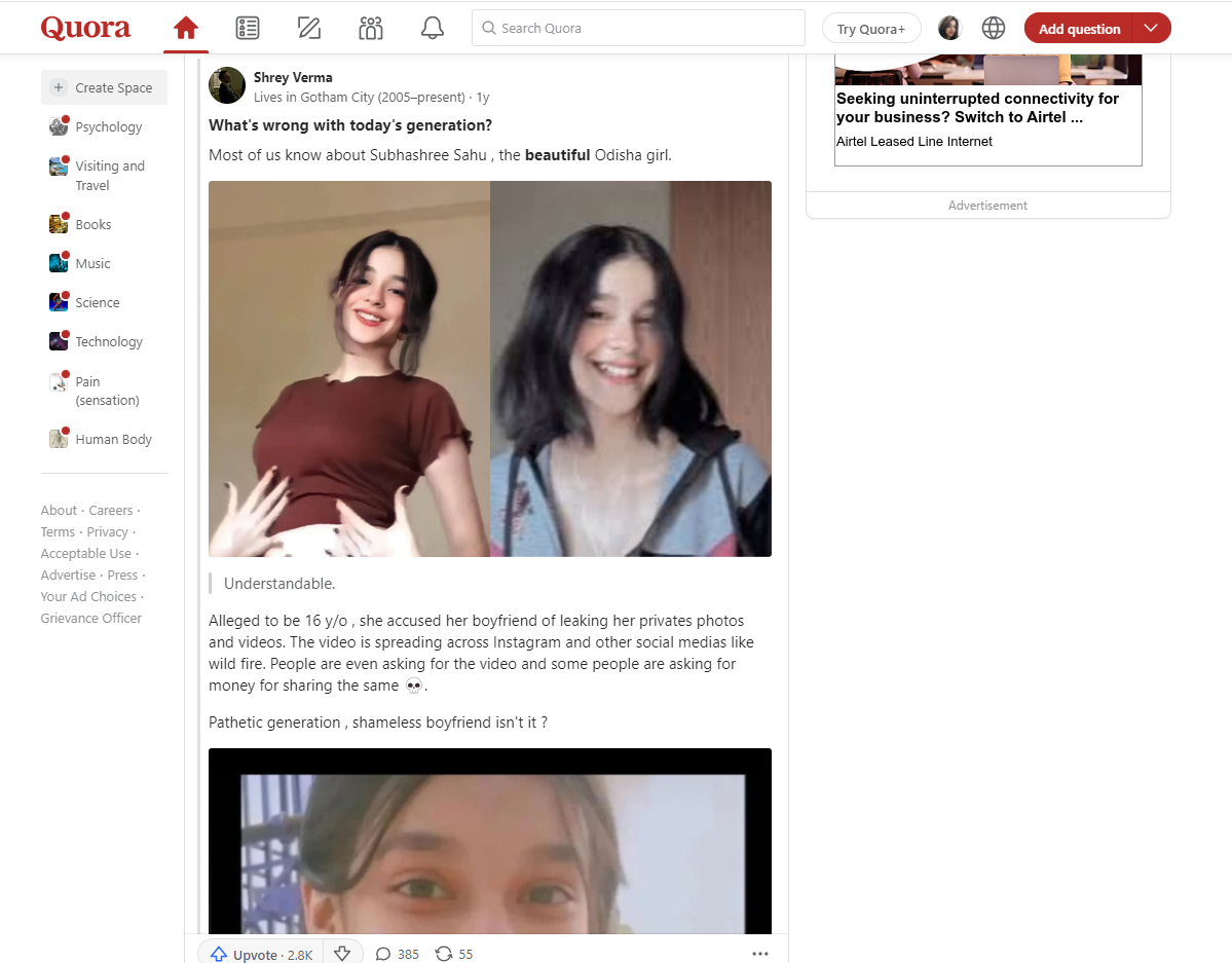 odisha girl Subhashree Sahu. She accused her partner of releasing her personal images and videos, claiming to be 16 years old. Like wildfire, the video is going viral on