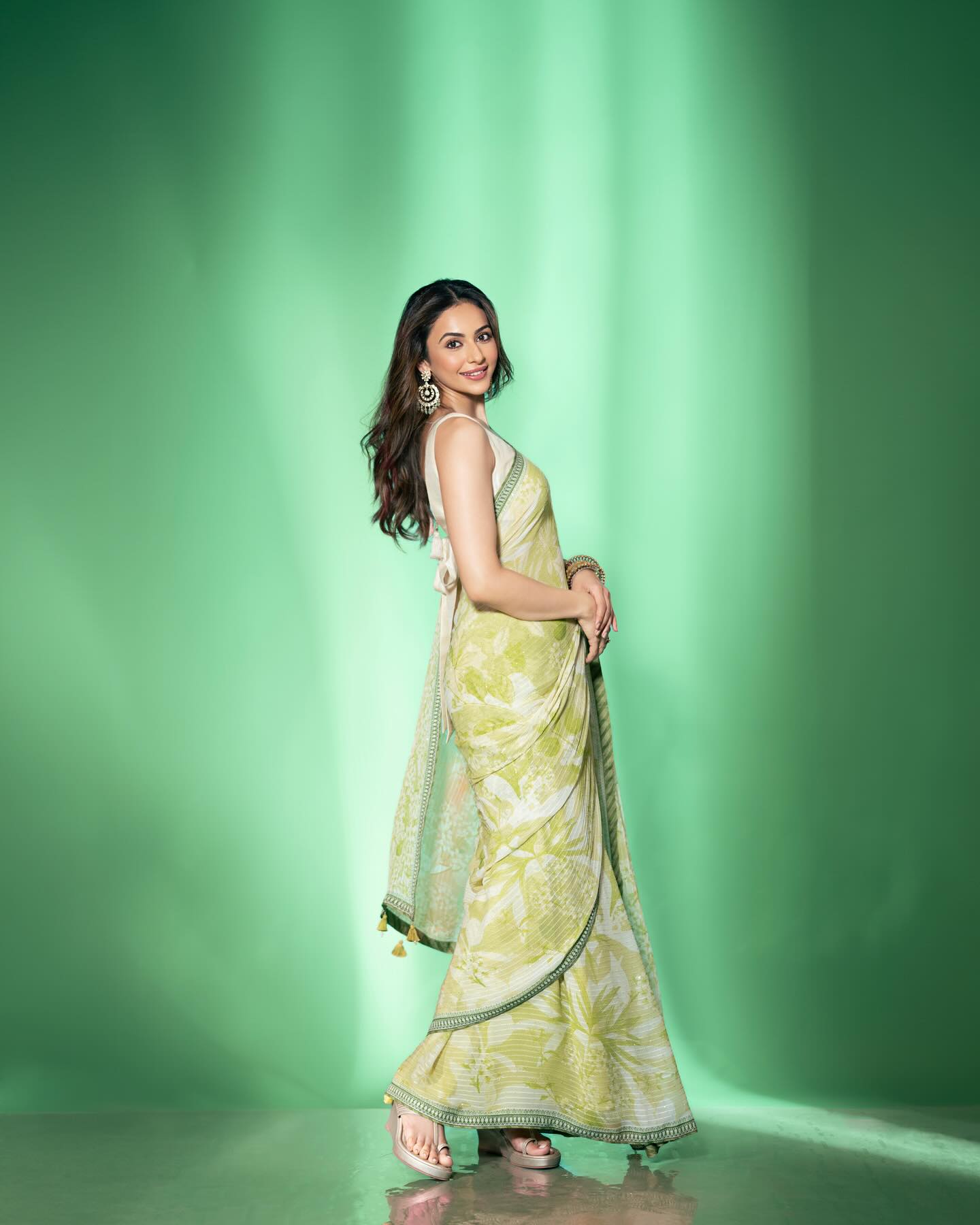 rakul expertly traverses the world of traditional apparel while adding a modern twist, whether it is through patterns, shapes, or vivid colors. The actress has since drawn attention while wearing a lime green saree. The actress revealed images from her most recent photo shoot on Instagram, where she looked gorgeous in a monsoon drape.