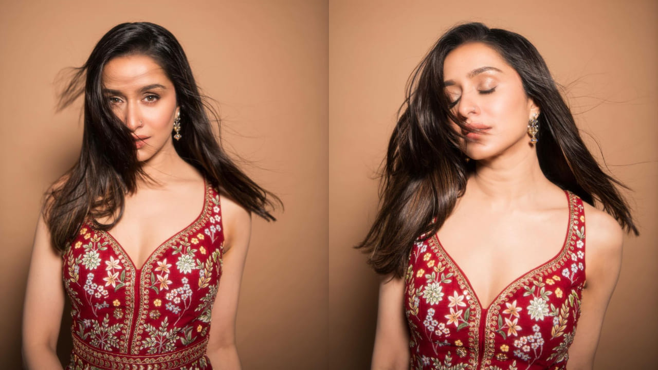 Her gorgeous crimson outfit is embellished with exquisite hand-painted pichhwai artwork. The elaborate and colorful patterns of this classic art form are well-known. Regarding the decorations, the gown has patti embroidery, which adds glitz and a glittering quality to the ensemble.